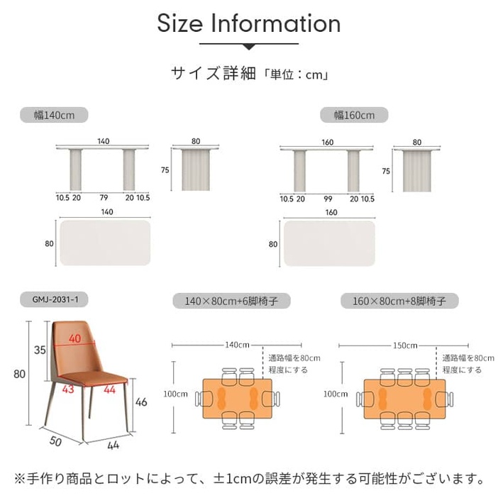 | サイズ | ■テーブル: 約140×80×75cm、約160×80×75cm ■椅子(GMJ-2031-1): 約44×50×80cm |