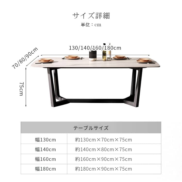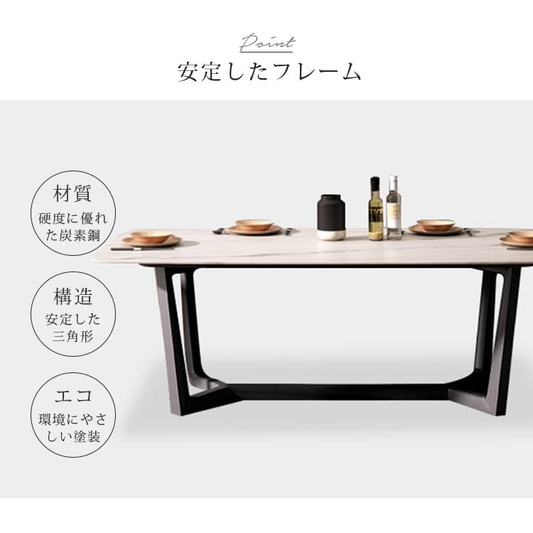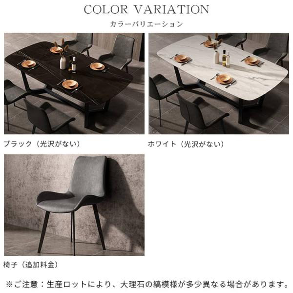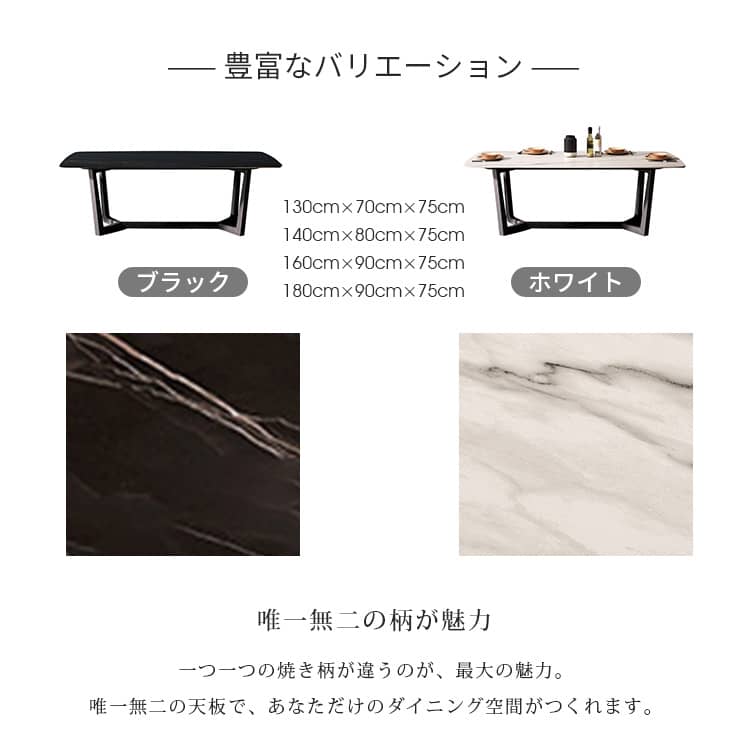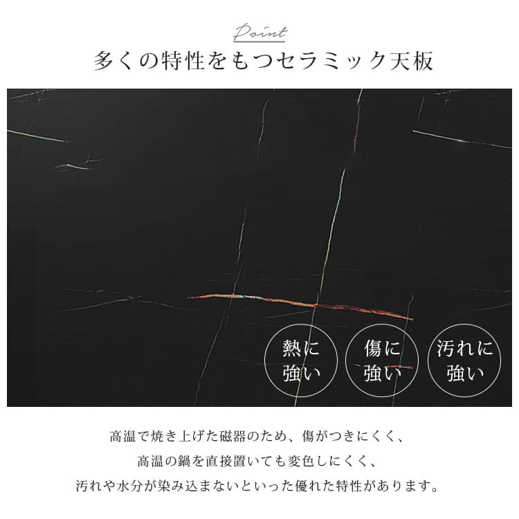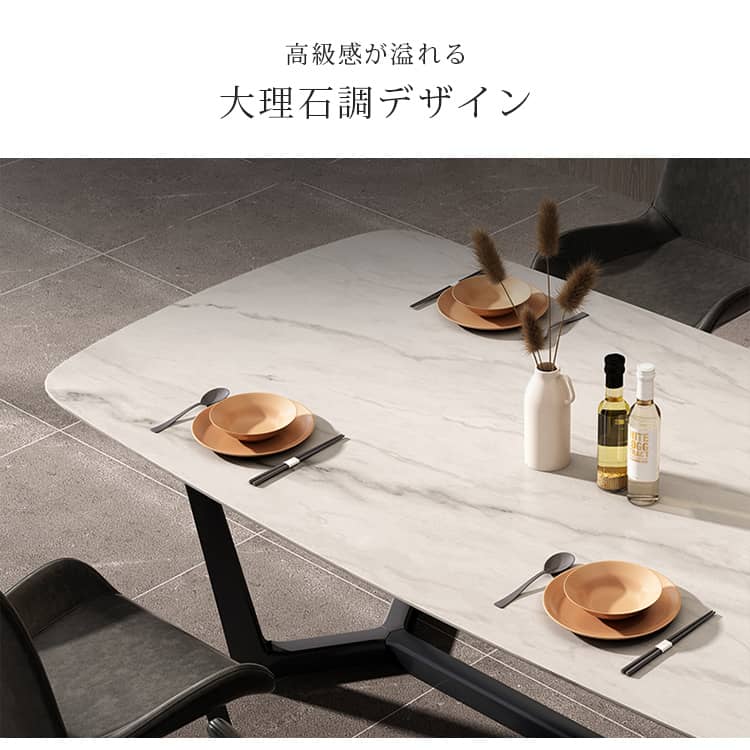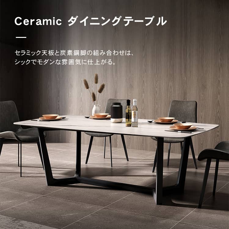 | おすすめのポイント | ■セラミック天板と炭素鋼脚の組み合わせは、シックでモダンな雰囲気を仕上がる。 ■多くの特性をもつセラミック天板。 ■高級感を溢れる大理石調デザイン。 ■強度に優れた炭素鋼フレーム、安定感をアップされます。 ■安全な角丸加工、ご安心してご使用いただけます。 ■椅子とセットで購入するのが可能です。 |