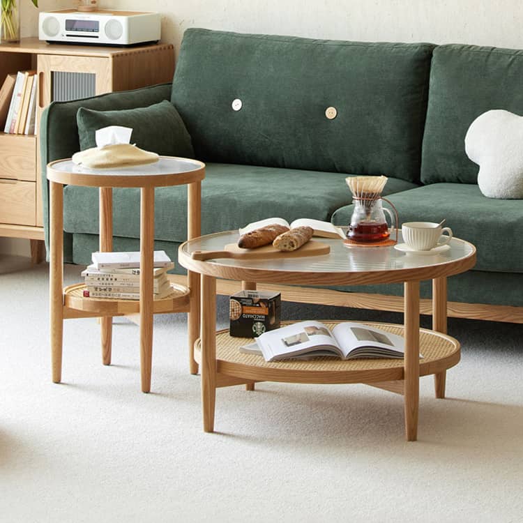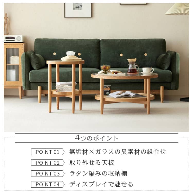| おすすめのポイント | ■ガラスと無垢材を組み合わせたリビングテーブル。 ■美観性と機能性を兼ね備えるモールガラス、お部屋の雰囲気をアップされます。 ■取り外せる天板、日常の掃除も楽々。 ■ラタン編みの収納棚、通気性・吸湿性に優れています。 ■お気に入りの小物や雑誌など、おしゃれにディスプレイできます。 ■強度に優れた素材で作り上げた脚部、商品本体の安全性をさらにアップされます。 ■安心の角丸加工、お子供のいるご家庭も安心してご使用いただけます。 |