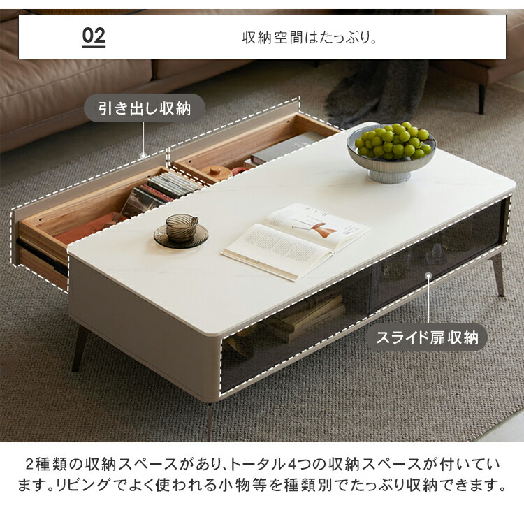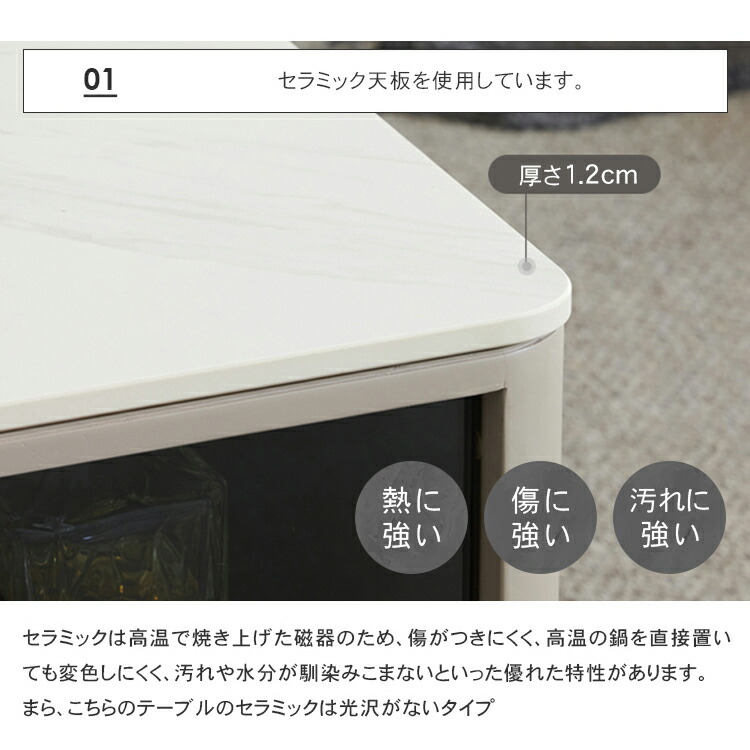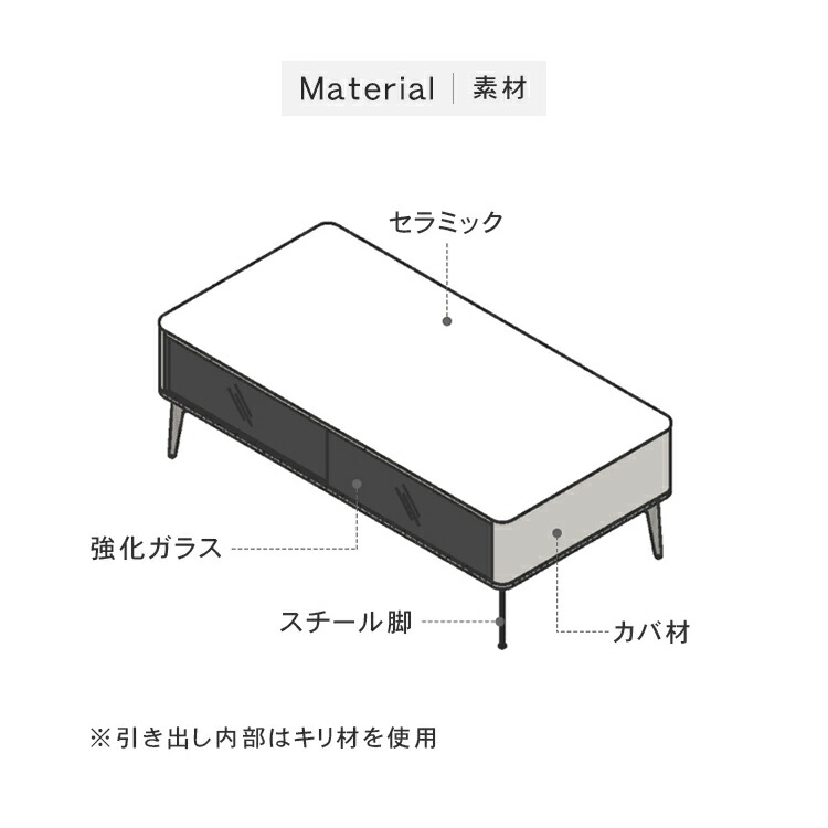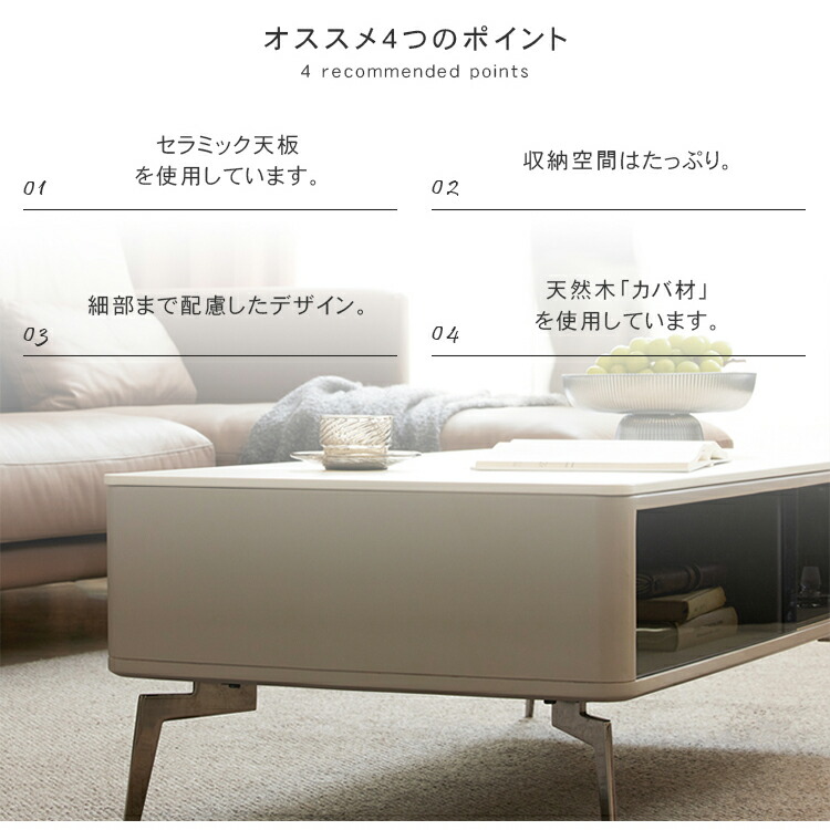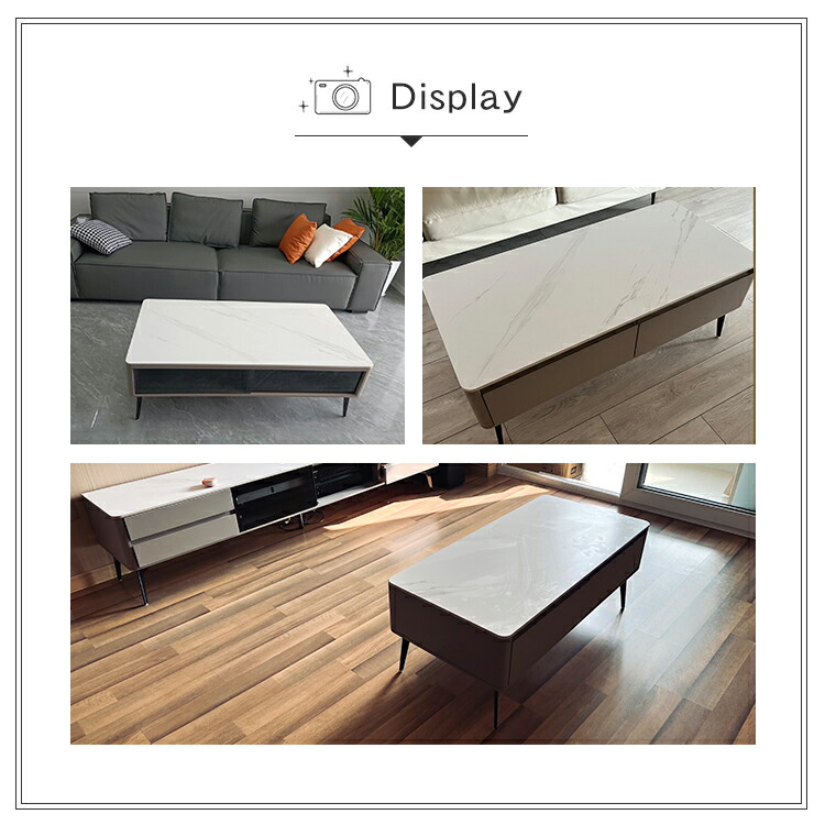 | おすすめのポイント | ■機能性に優れたセラミック天板を使用しております。 ■天板の下には収納スペースが付いており、雑もをたっぷり収納できます。 ■天然木「カバ材」を採用して、頑丈で長年愛用できます。 ■安定性の高いスチール脚を使用しており、掃除もしやすいです。 ■見た目と実用性が兼ね備えるリビングテーブル。どんな部屋にも馴染みやすいです。 |