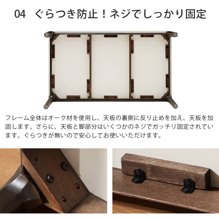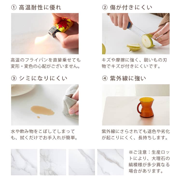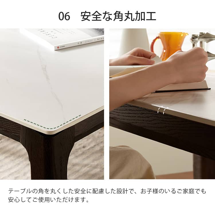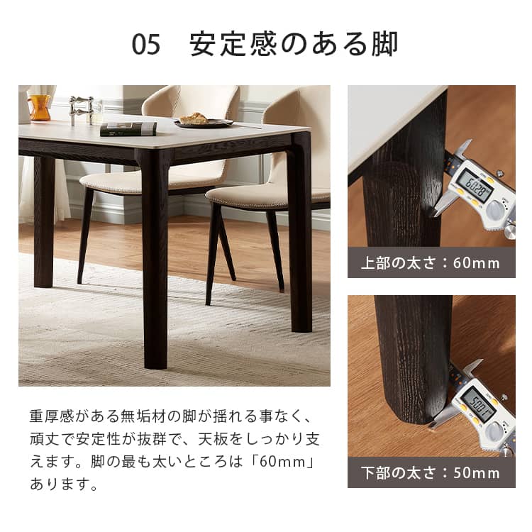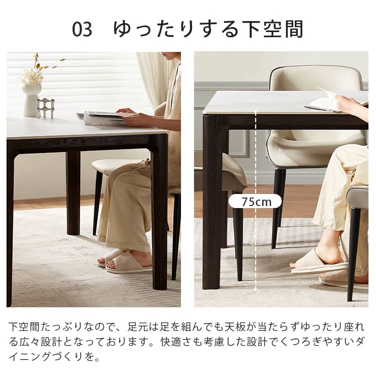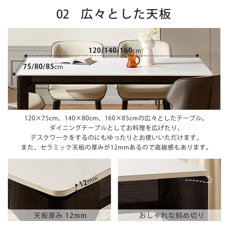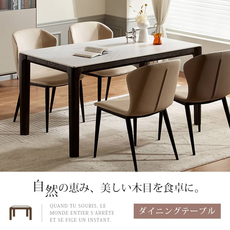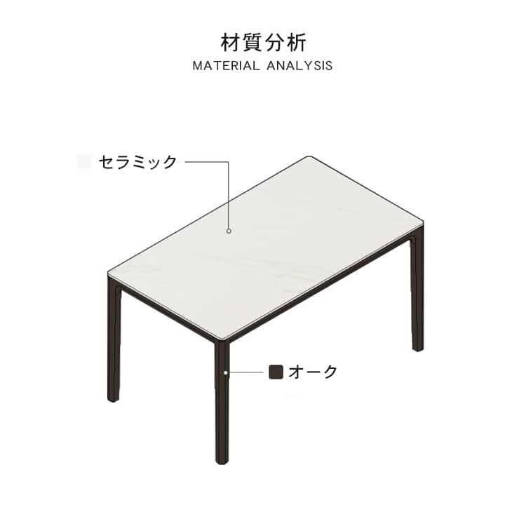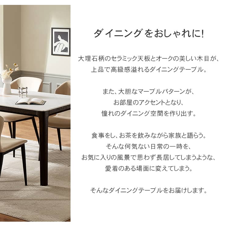 | おすすめのポイント | ■ムードが漂う大理石調セラミック天板。 ■広々とした天板、ダイニングテーブルとしてもデスクワークとしても使用できます。 ■ゆったりする下空間、足を組んでも天板に当たらずゆったり座れる。 ■フレーム全体はオーク材を使用しており、裏側に反り止めを加え、ネジでしっかり固定します。 ■安定感のある脚、天板をしっかりと支えています。 ■優しい角丸、面取り加工、お子供がいる家庭も安心してご使用いただけます。 |
