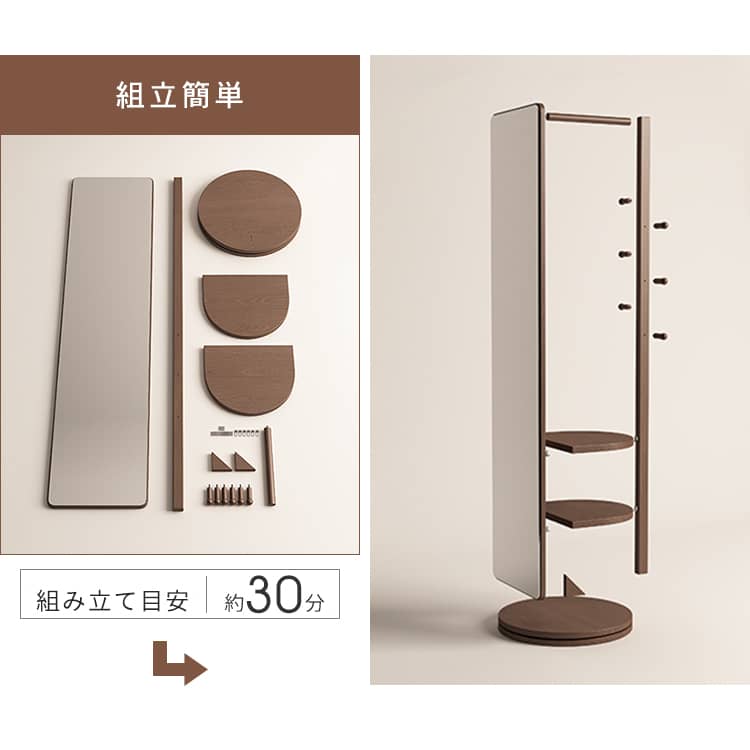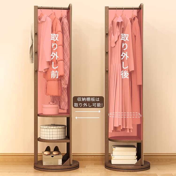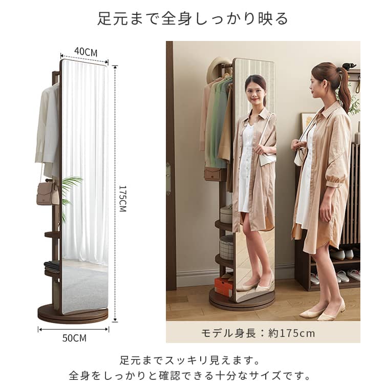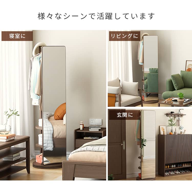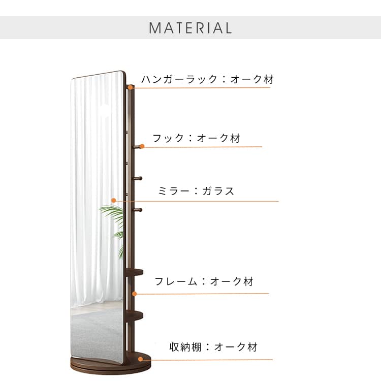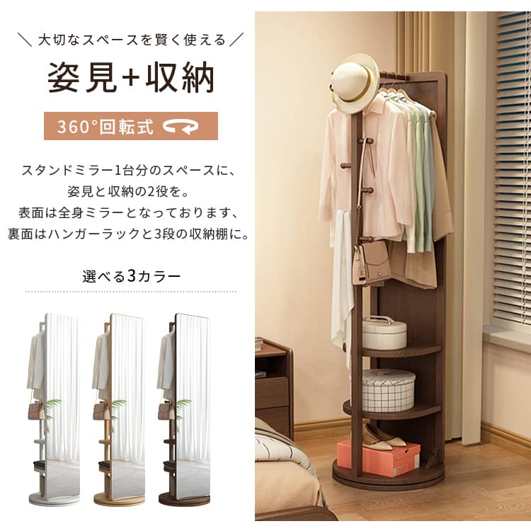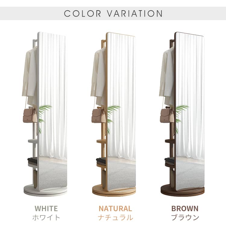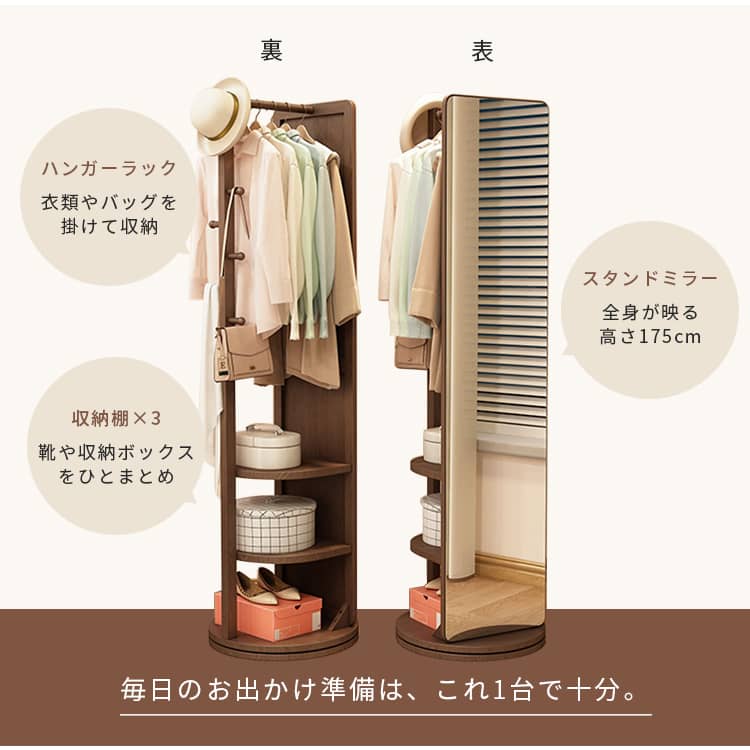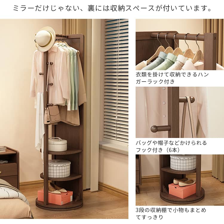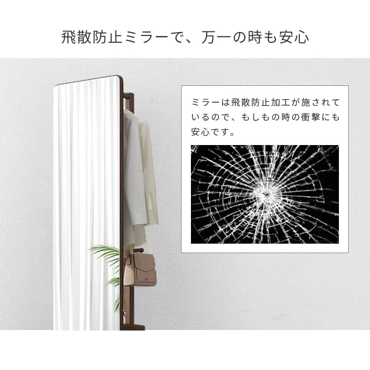 | おすすめのポイント | ■スタンドミラー1台のスペースに、姿見と収納の2役を。 ■裏にハンガーラックが付いており、衣類やバッグを掛けて収納できます。 ■足元まで全身しっかり映る。 ■飛散防止ミラーで、万が一の時も安心。 ■ニーズにあわせて、様々なシーンで活躍しています。 ■三角構造でフレームをしっかりと支えています。 ■組み立て簡単、一人でも完成できます。 ■需要にあわせて、収納棚板は取り外し可能。 |