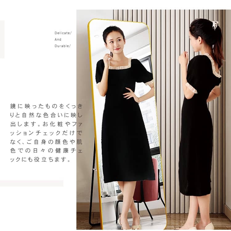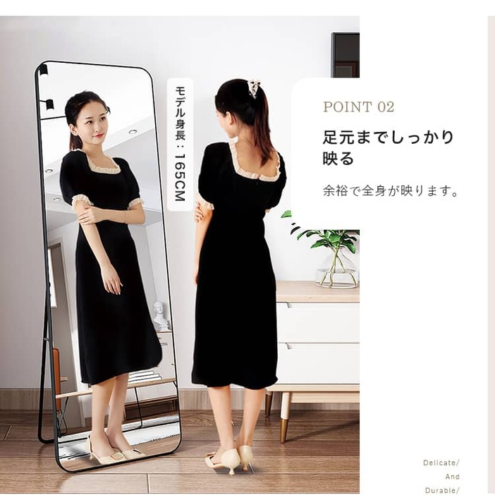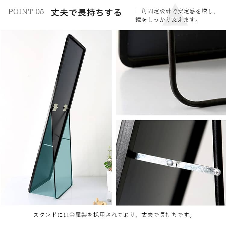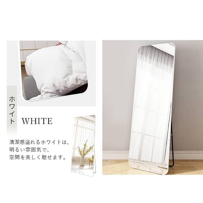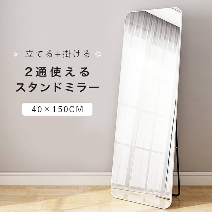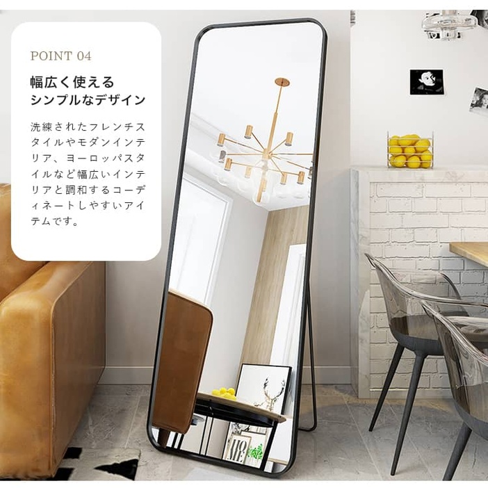 | おすすめのポイント | ■2way通りに使えるスタンドミラー。 ■場所を取らないスリムサイズ。 ■足元まで全身しっかり映る。 ■雰囲気が際立つアルミフレーム、どんなインテリアにも適応されます。 ■幅広く使えるシンプルなデザイン。 ■全身チェックはもちろん、趣味やインテリアなど様々な用途にぴったり。 ■三角構造で安定感をアップさせ、丈夫で長持ちする。 ■四角を丸くし、安心してご使用いただけます。 |