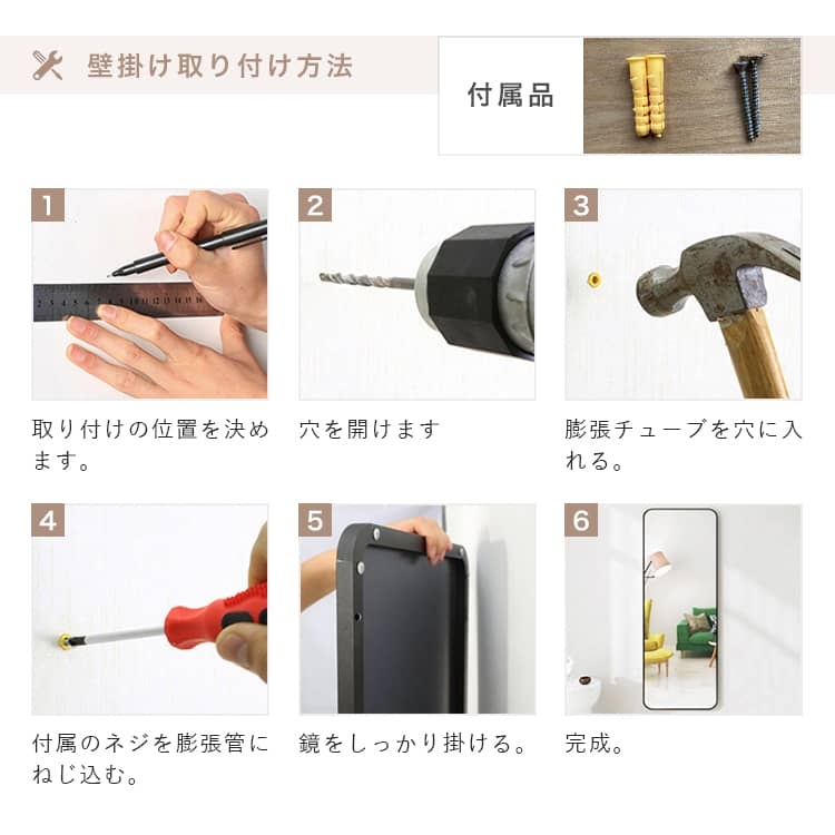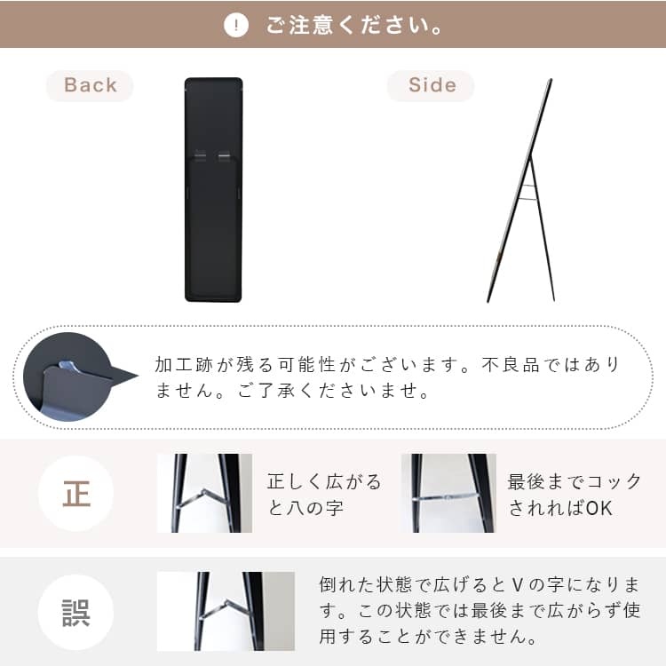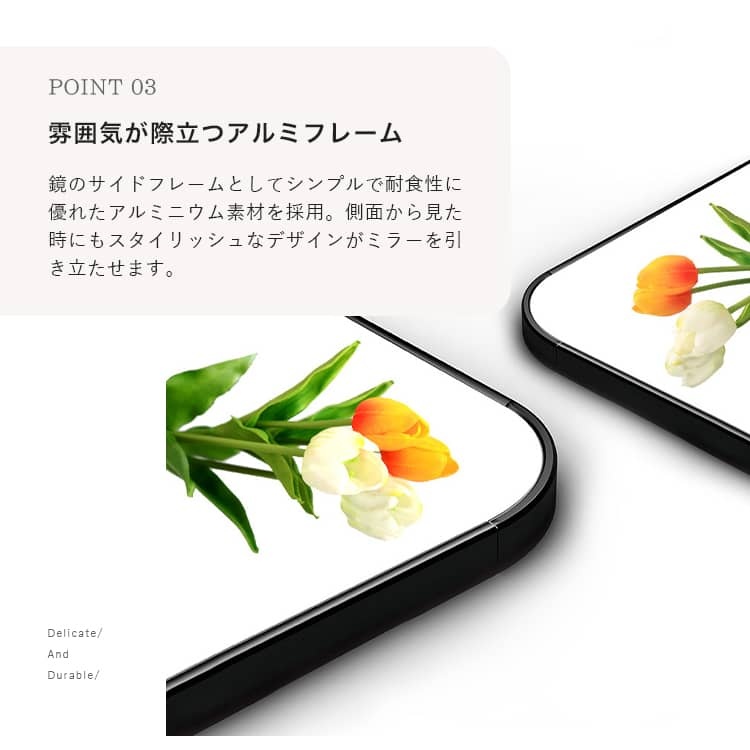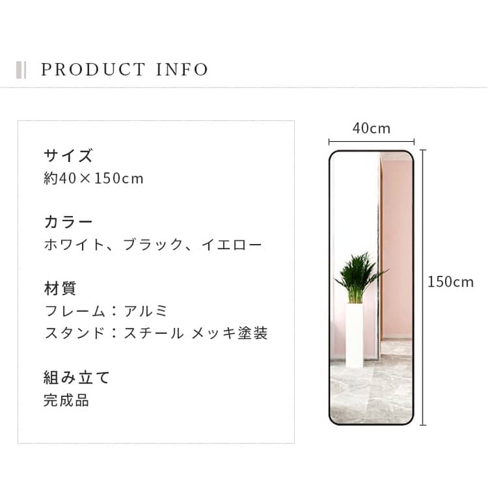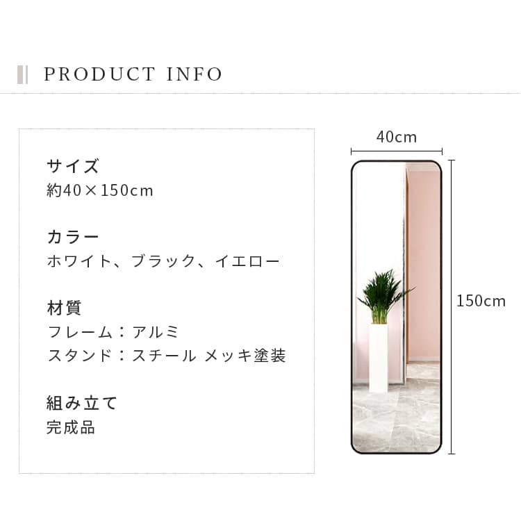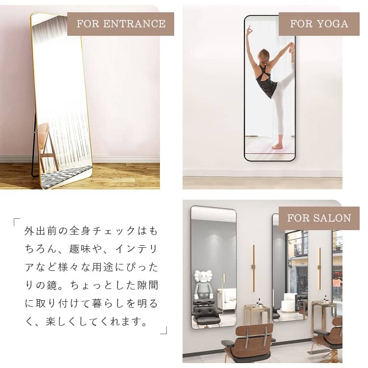 | おすすめのポイント | ■2way通りに使えるスタンドミラー。 ■場所を取らないスリムサイズ。 ■足元まで全身しっかり映る。 ■雰囲気が際立つアルミフレーム、どんなインテリアにも適応されます。 ■幅広く使えるシンプルなデザイン。 ■全身チェックはもちろん、趣味やインテリアなど様々な用途にぴったり。 ■三角構造で安定感をアップさせ、丈夫で長持ちする。 ■四角を丸くし、安心してご使用いただけます。 |