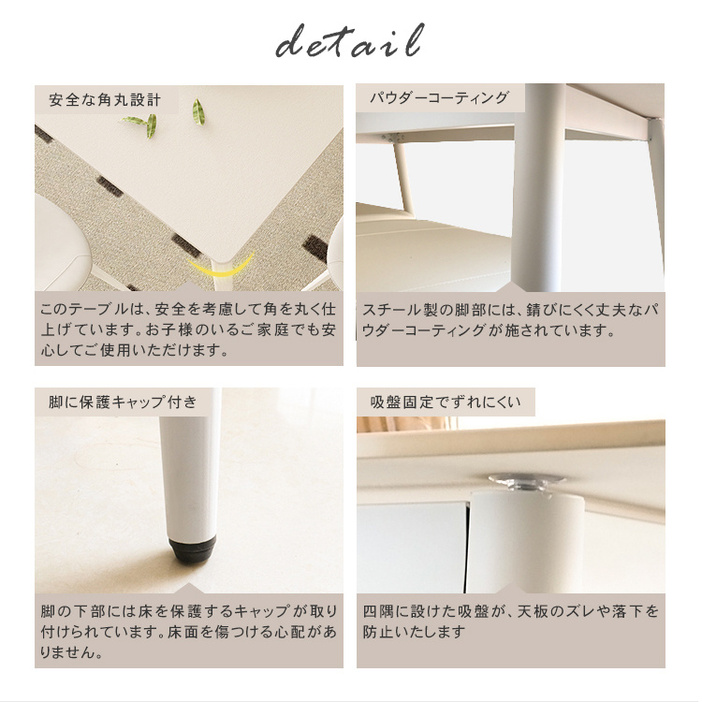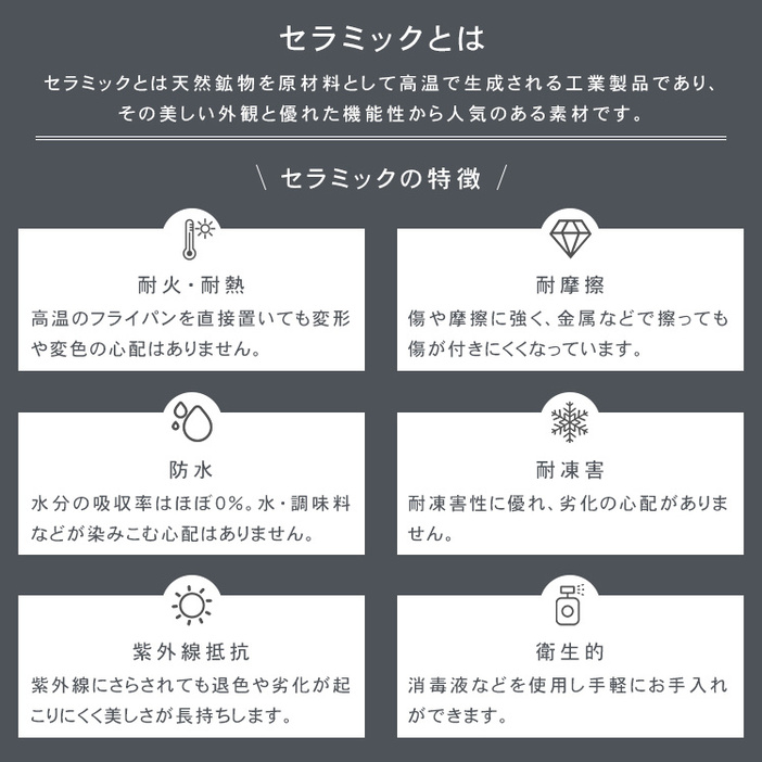 | おすすめのポイント | ■椅子とセットで購入可能。 ■高温のフライパンや鍋を直接置いても、変色や変形しない。 ■表面硬度が高く、金属などでこすってもキズが付きにくくなっている。 ■調味料や薬品などが染み込まなず拭くだけでお手入れできる。 |