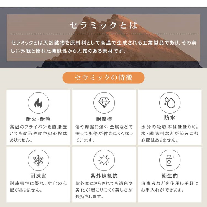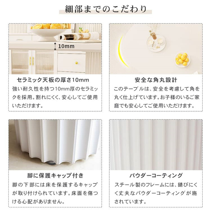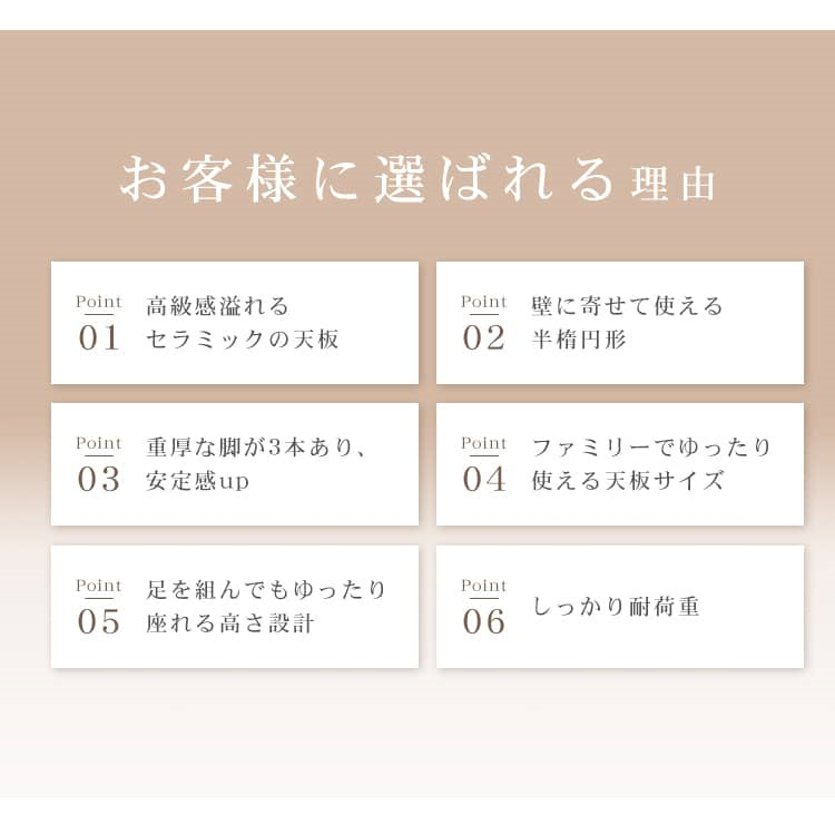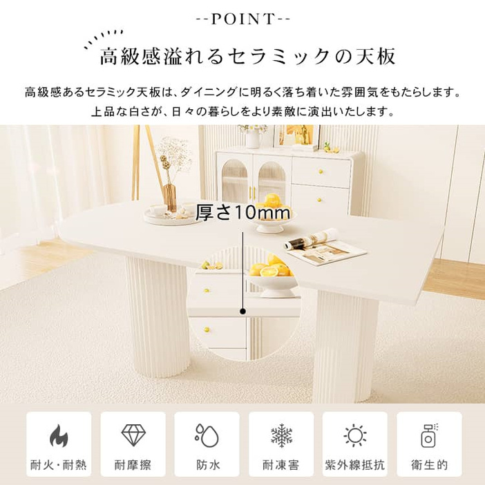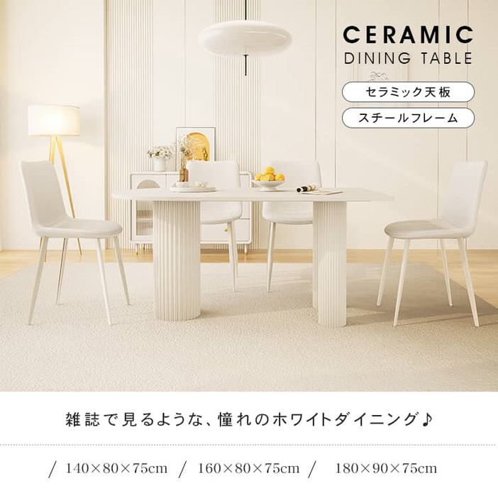 | おすすめのポイント | ■セラミック天板とアクリルの組み合わせは、エレガントでモダンな印象を与えてくれます。 ■機能性に優れたセラミック天板。 ■高い強度を誇るスチール、全体をしっかりと支えています。 ■面取り加工、ご安心して使用させていただきます。 ■同じシリーズのいすと共に購入可能です。 |