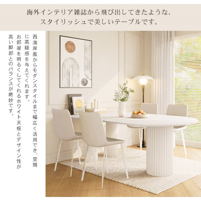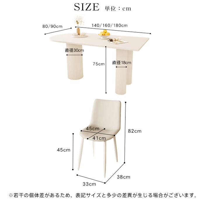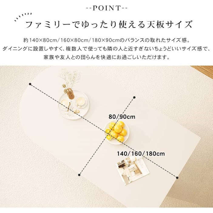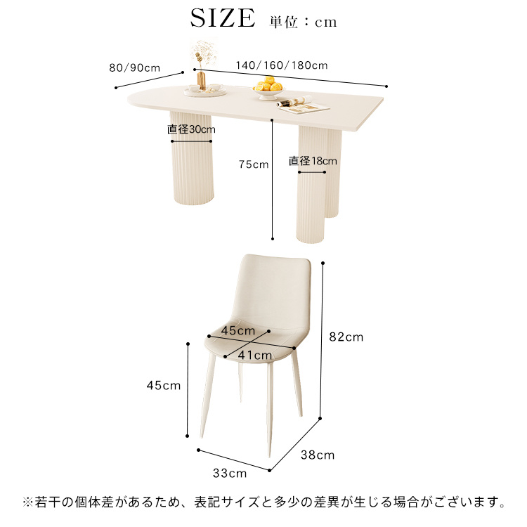 | 商品外寸 | ダイニングテーブル ■幅140cm×奥行き80cm×高さ75cm ■幅160cm×奥行き80cm×高さ75cm ■幅180cm×奥行き90cm×高さ75cm ■いす:幅45cm×奥行き43cm×高さ78cm |