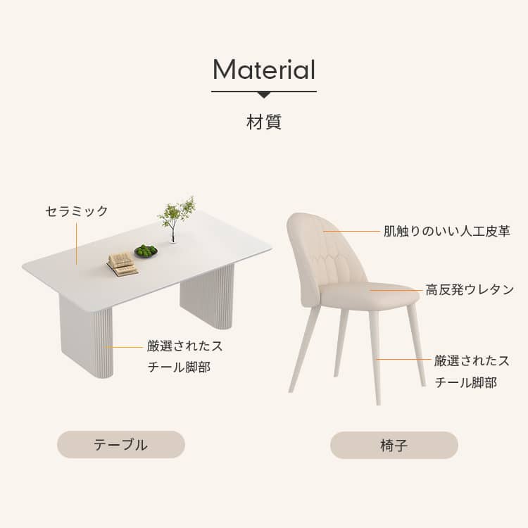 | 材質 | 【テーブル】セラミック、スチール 【いす】人工皮革、ウレタン、スチール |