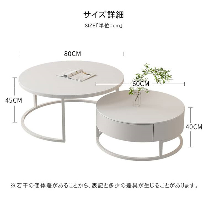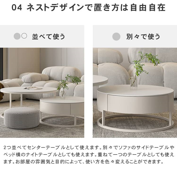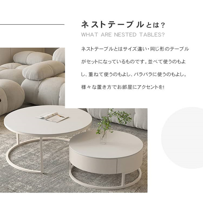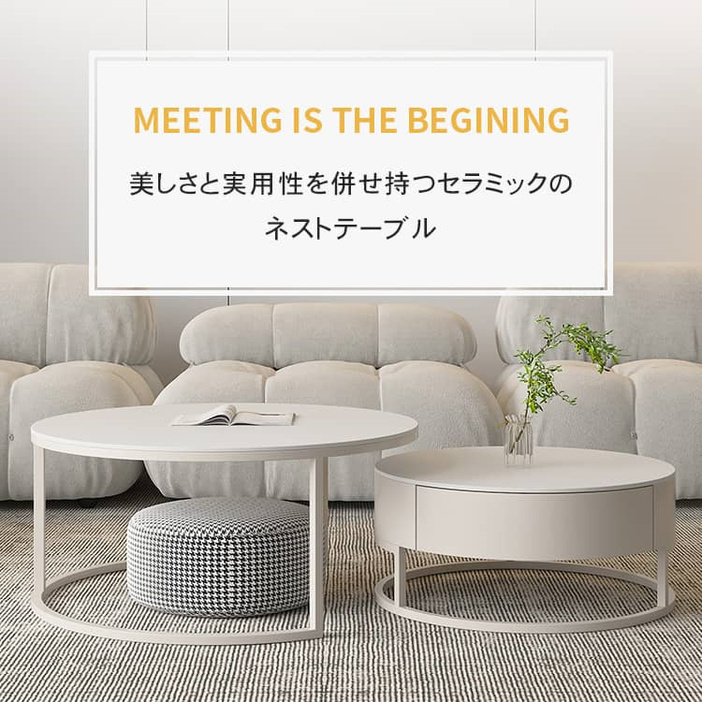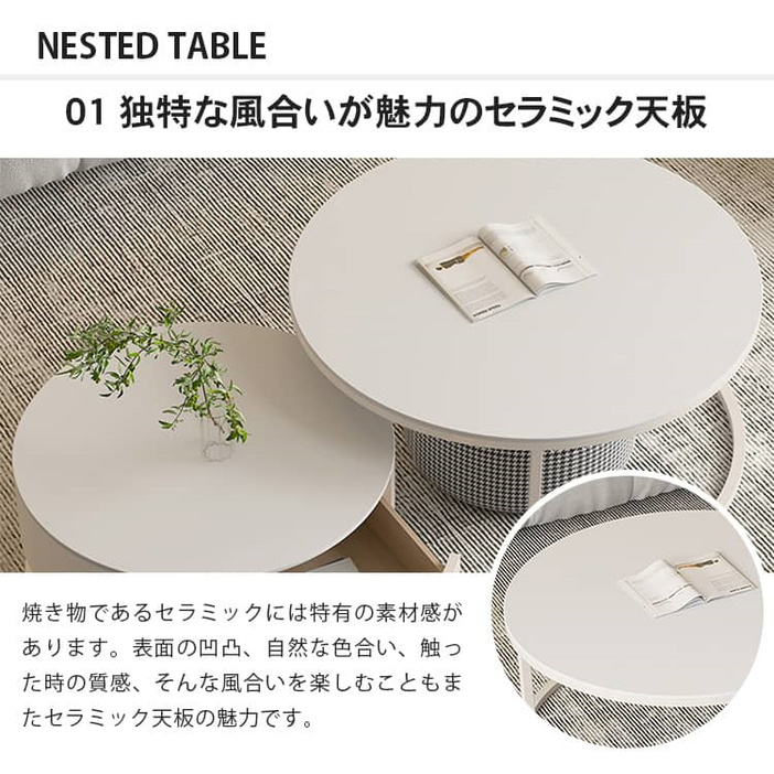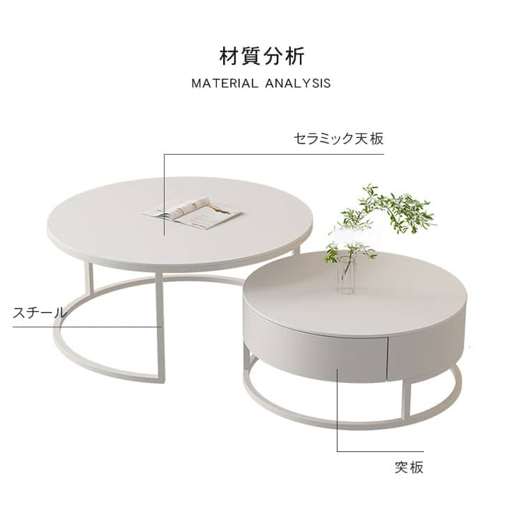 | おすすめのポイント | ■大小2個セット。 ■質感が溢れるフレーム フレームは頑丈な金属材を使用したので、変形しにくく、耐荷重にも心配いらない。 ■どんなインタリアにも馴染みやすいのホワイトセラミック天板 ■円形のネストテーブルであれば、角がないのでけがの心配が少なく安心だ。 |
