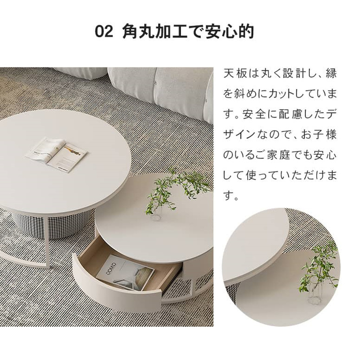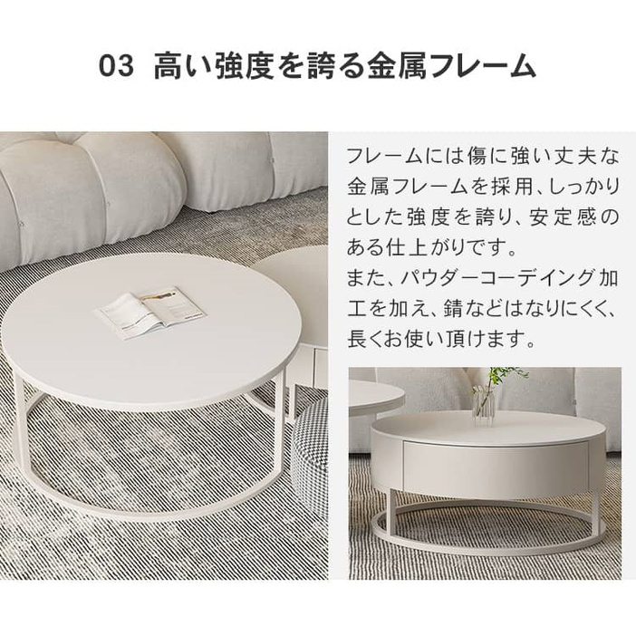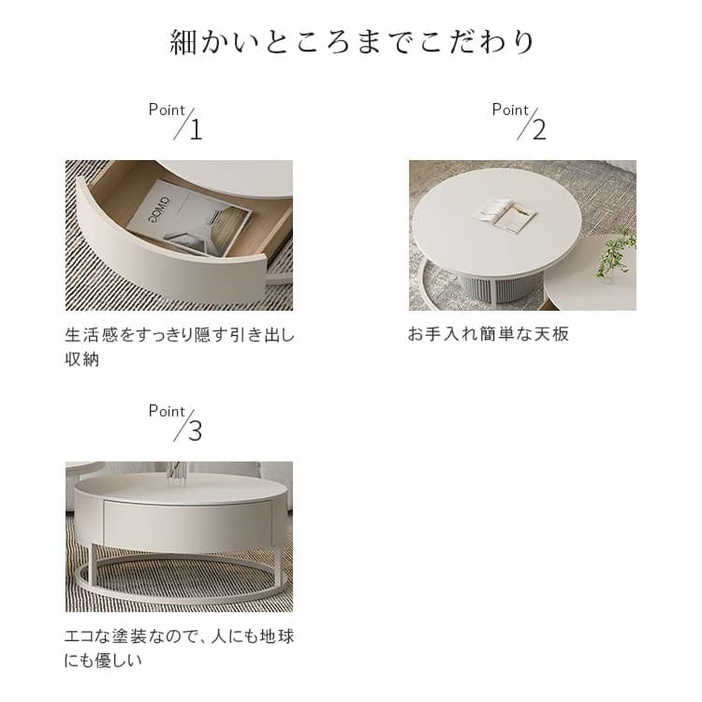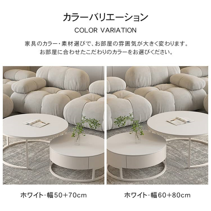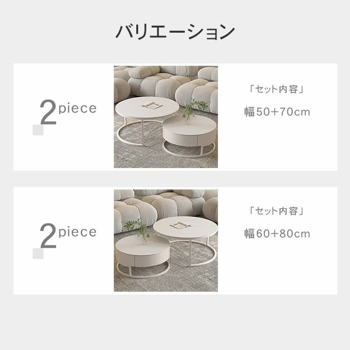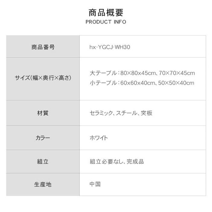 | おすすめのポイント | ■大小2個セット。 ■質感が溢れるフレーム フレームは頑丈な金属材を使用したので、変形しにくく、耐荷重にも心配いらない。 ■どんなインタリアにも馴染みやすいのホワイトセラミック天板 ■円形のネストテーブルであれば、角がないのでけがの心配が少なく安心だ。 |