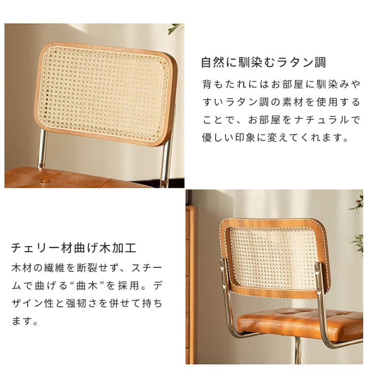 | 材質 | 背もたれ:ラタン、チェリー材 座面:PUレザー、ウレタン フレーム:ステンレス |