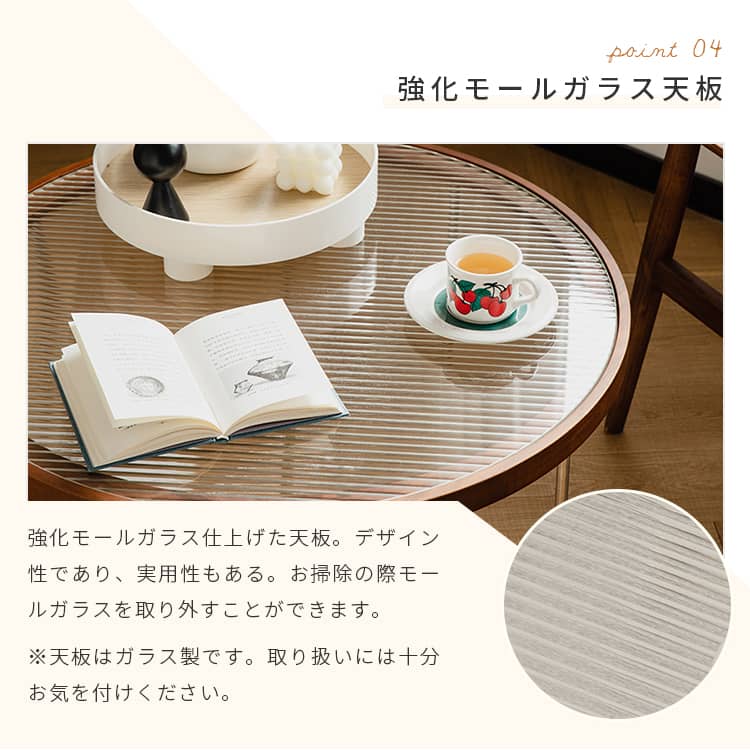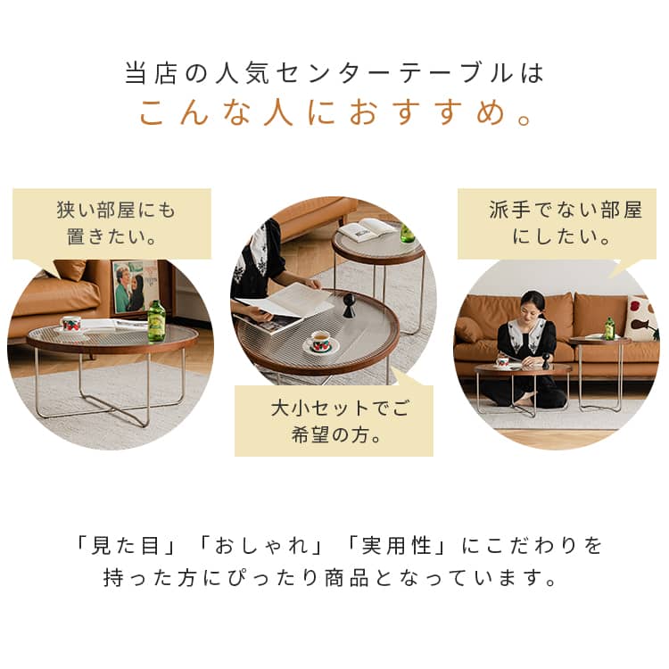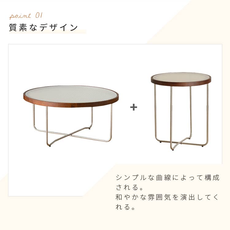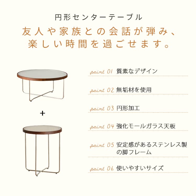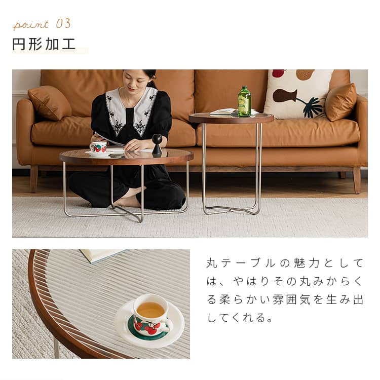 | おすすめのポイント | ■シンプルな曲線によって構成される。 ■テーブルの角には面取り加工でお子様いるご家庭も安心に使える。 ■丸テーブルの魅力としては、やはりその丸みからくる柔らかい雰囲気を生み出してくれる。 ■コンパクトサイズなので、持ち運びやすい。 |