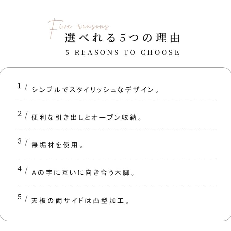 | おすすめのポイント | ■一人暮らしに丁度いいサイズ。 ■テーブルの角には面取り加工でお子様いるご家庭も安心に使える。 ■取り出しやすい大容量引出付きで、収納にとても便利です。 ■無垢材の美しい木目や質感を最大限残した仕上げです。 |