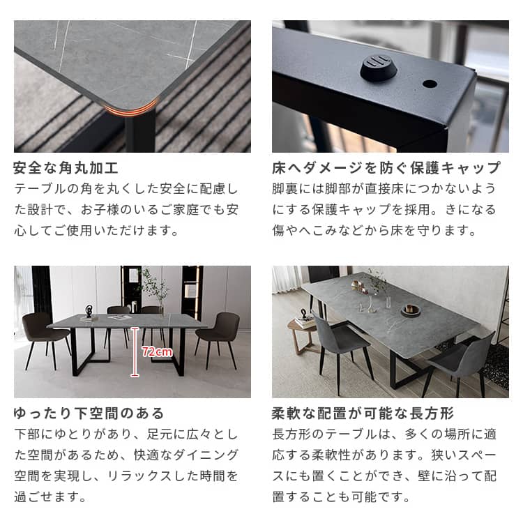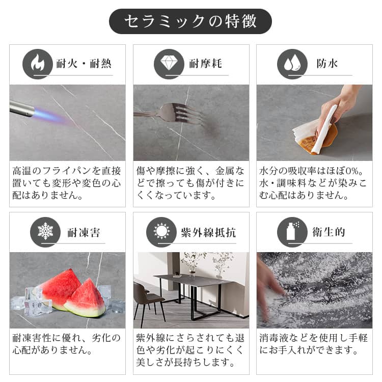 | おすすめのポイント | ■高級感のあるセラミック天板。 ■落ち着いたアンティークな風合いは男前なインテリアやブルックリンスタイルとの相性もぴったり。 ■天板には耐高温、傷が付きにくい、シミになりにくい、衛生的などの特徴があります。 |
