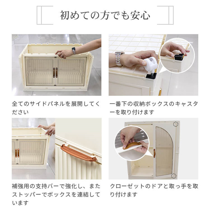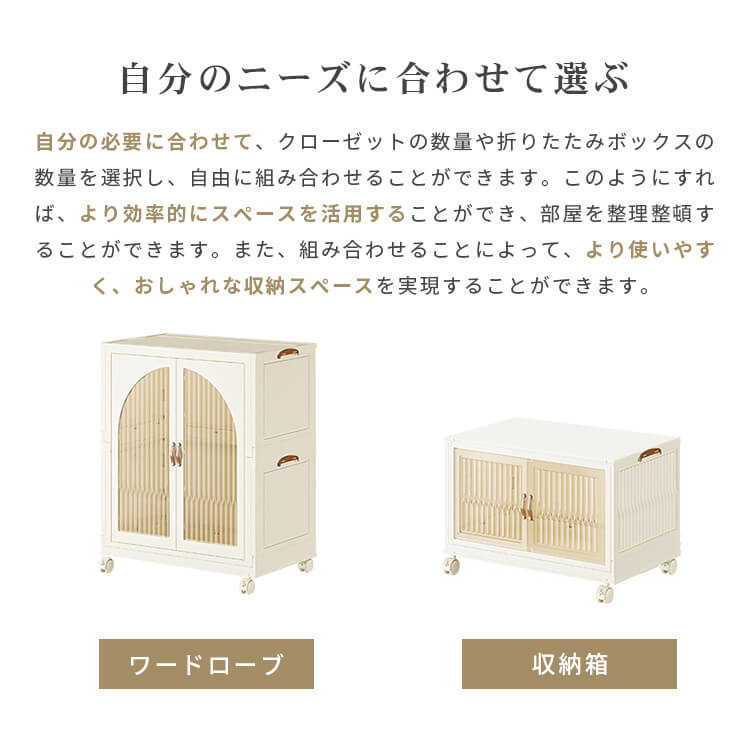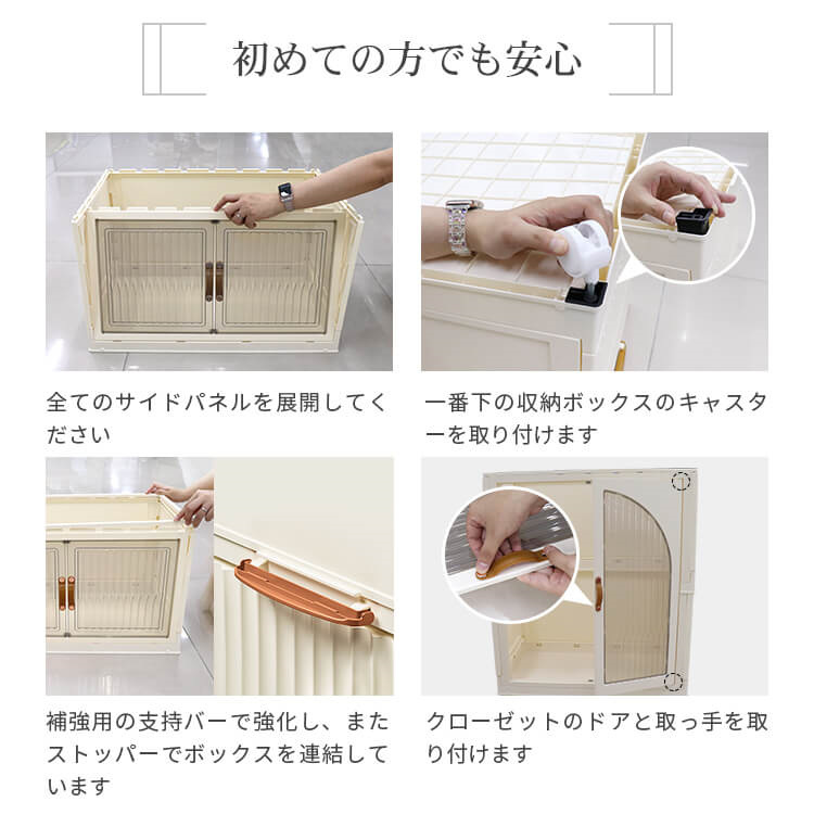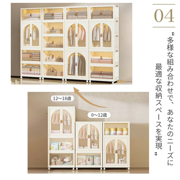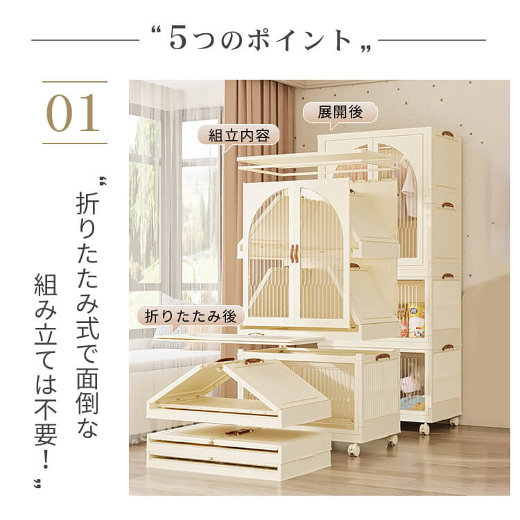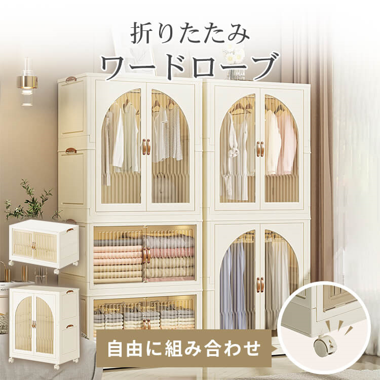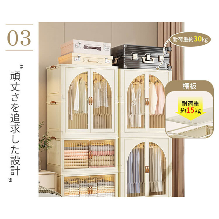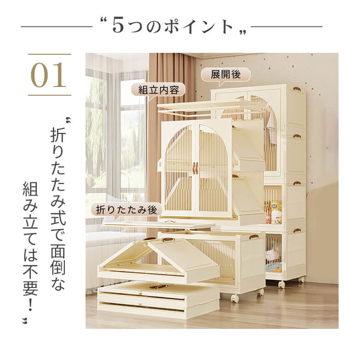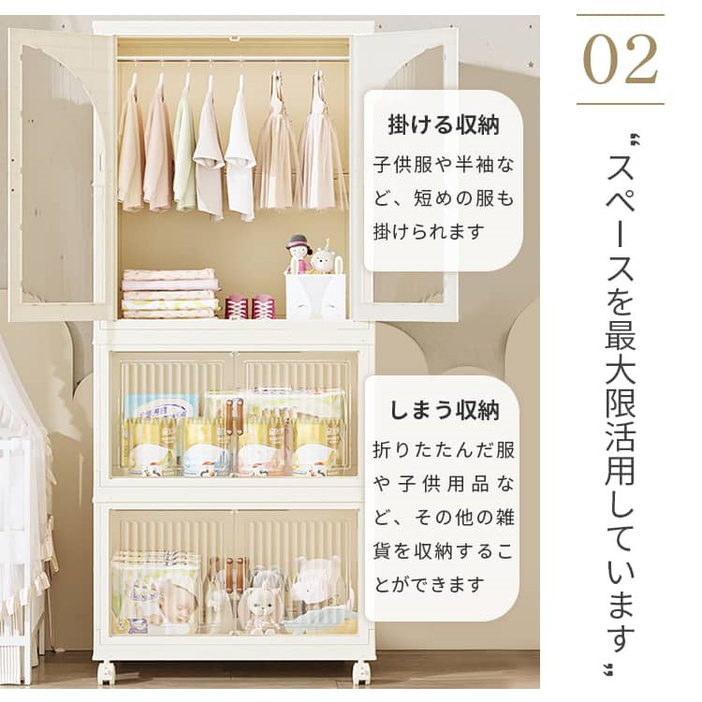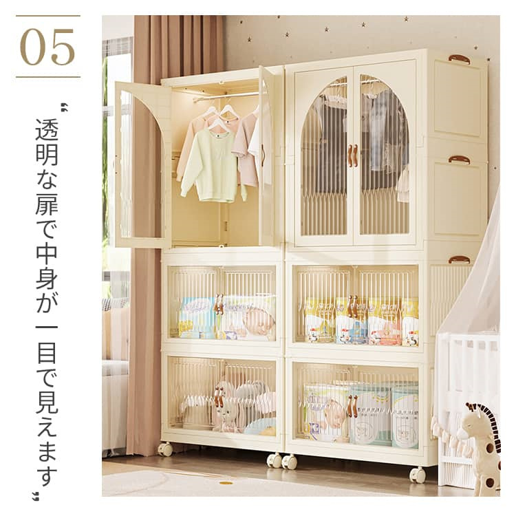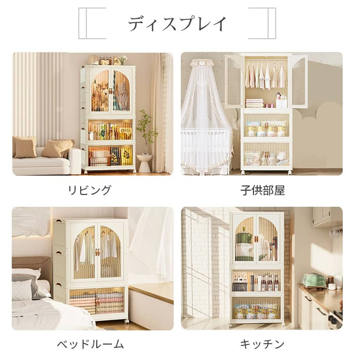 | おすすめのポイント | ■折りたたみ式で面倒な組み立ては不要。 ■衣類やおもちゃなどたっぷり収納できます。 ■省スペース設計、使用しない時は折りたたんで、家具の隙間にサッと納めます。 ■透明な扉で中身が一目で見えます。 |