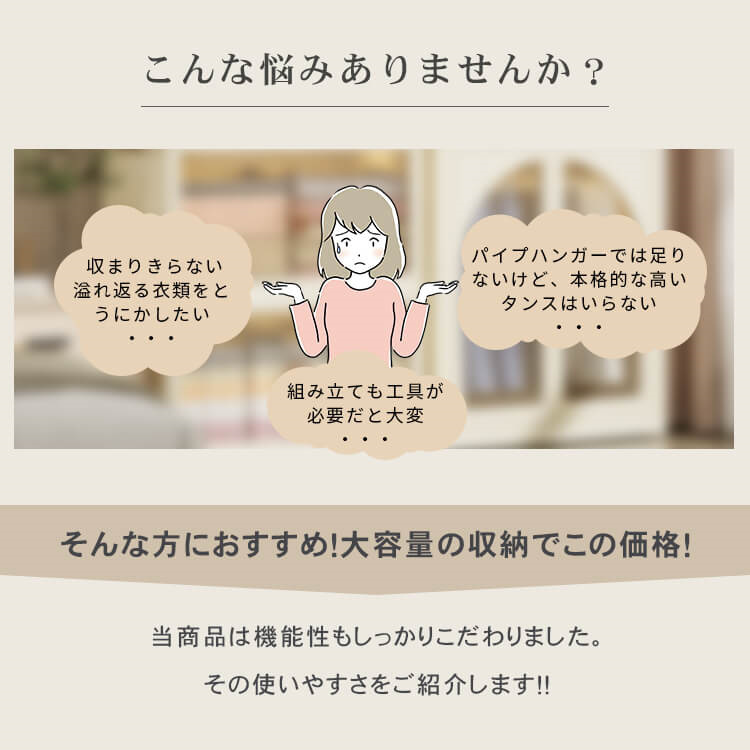 | 梱包サイズ | ワードローブ: 46.5×24.5×72cm、重さ:約6.8kg 収納箱:46.5×13×71.5cm、重さ:約4.2kg |