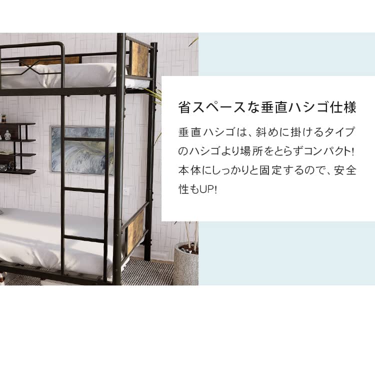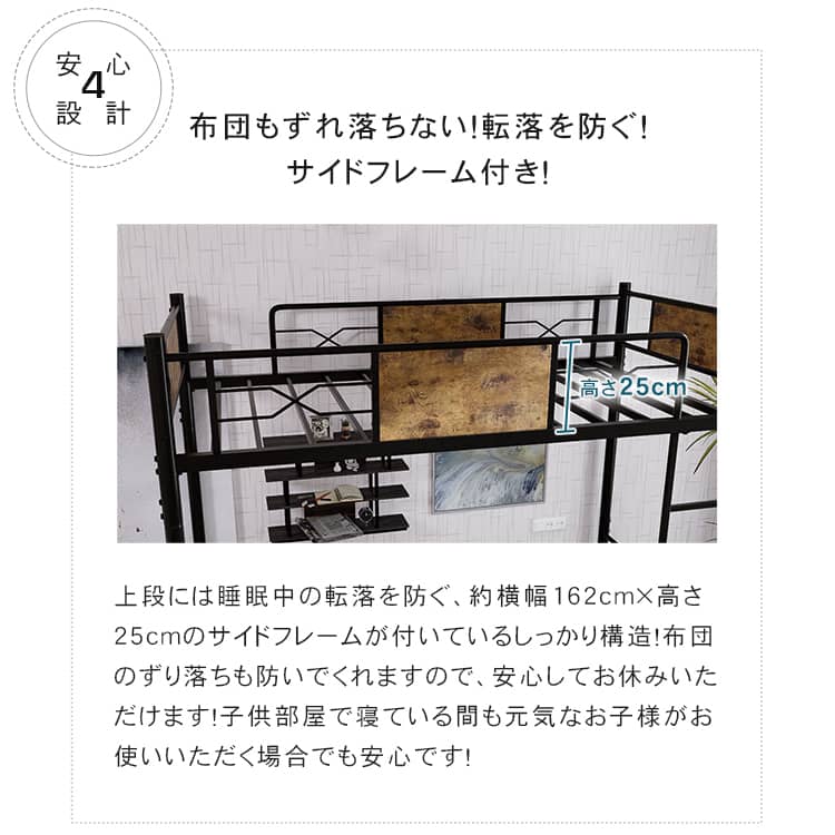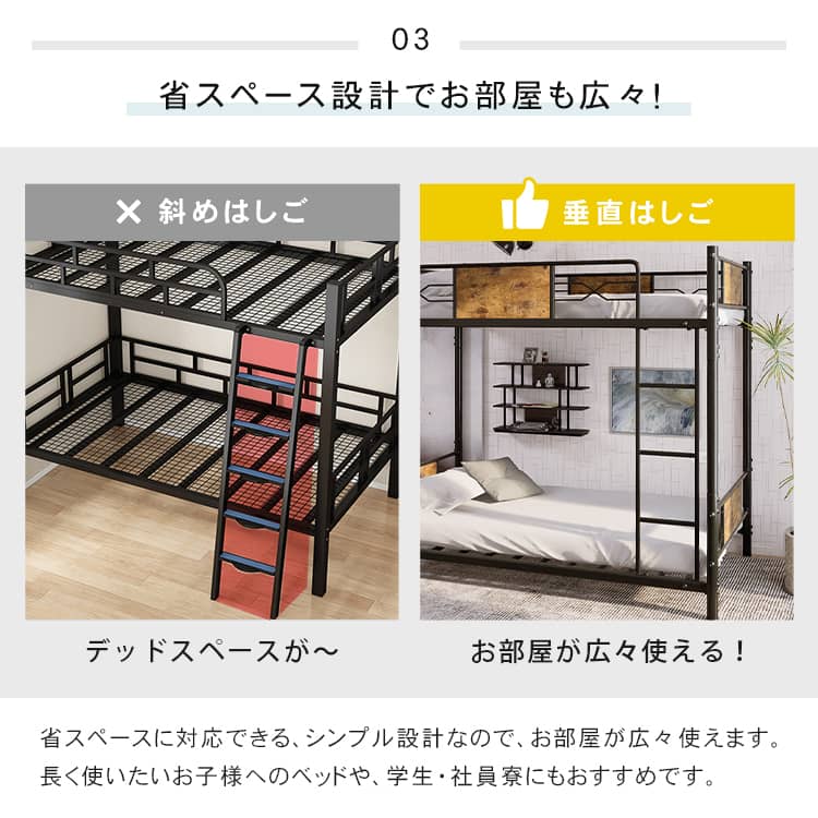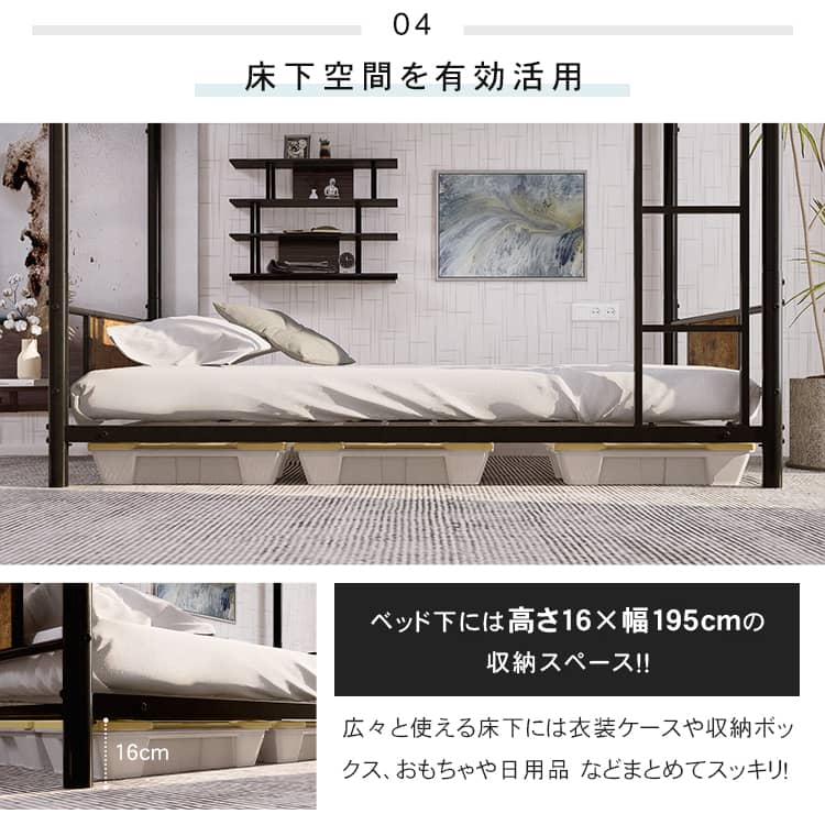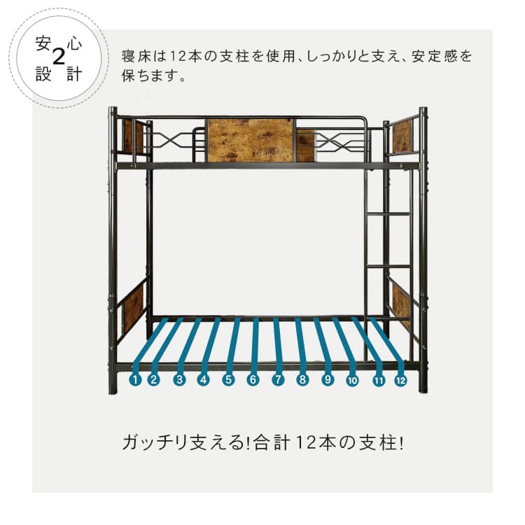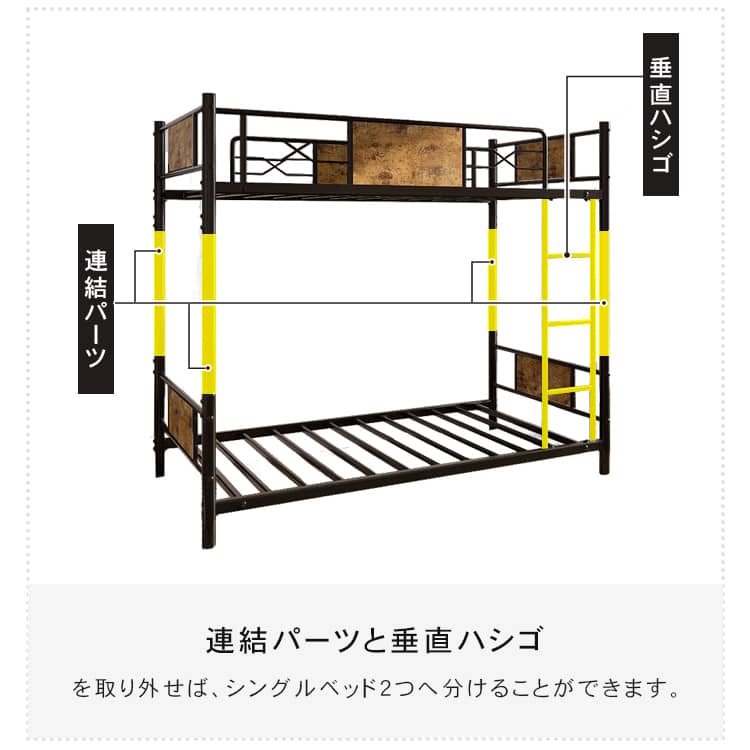 | おすすめのポイント | 1.寝床は合計12本の支柱を使って、安心・安全の強度。 2.しっかり支える耐荷重150kg。 3.サイドフレーム付き!布団もずれ落ちない!転落防止! 4.上下分割構造、シングルベッドとしても使用できるタイプ。 5.省スペース設計で、部屋を広々と見えます。 6.ベッド下には高さ16×横195cmの収納スペースあり、日用品などまとめてスッキリ。 7.通気性も抜群で年中快適に過ごせます。 8.絶妙な異素材の組み合わせを楽しめる。 9.安全な角丸加工、お子様のいるご家庭も安心してご使用頂けます。 |