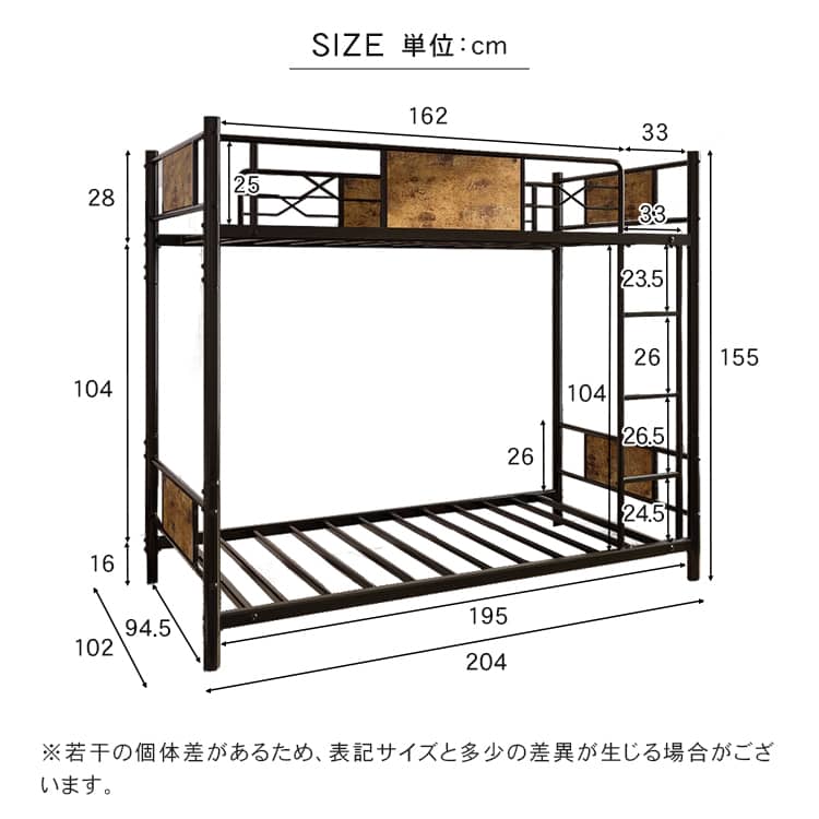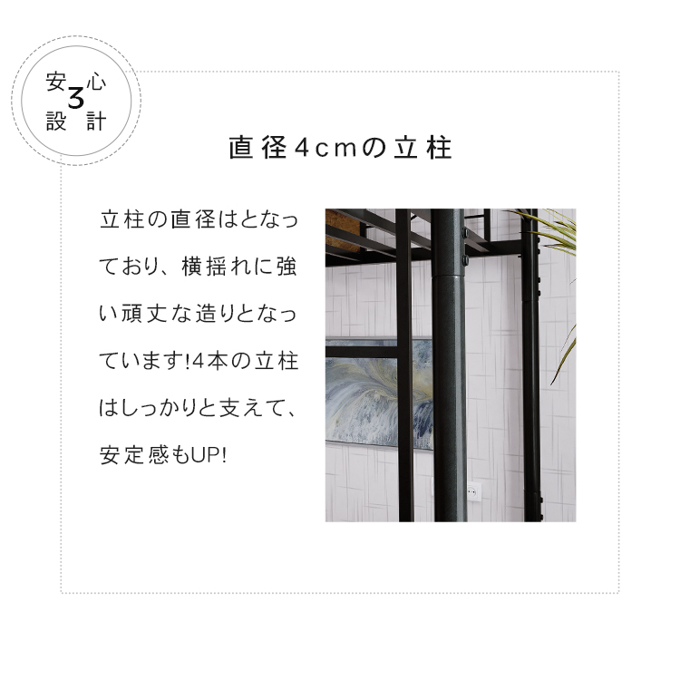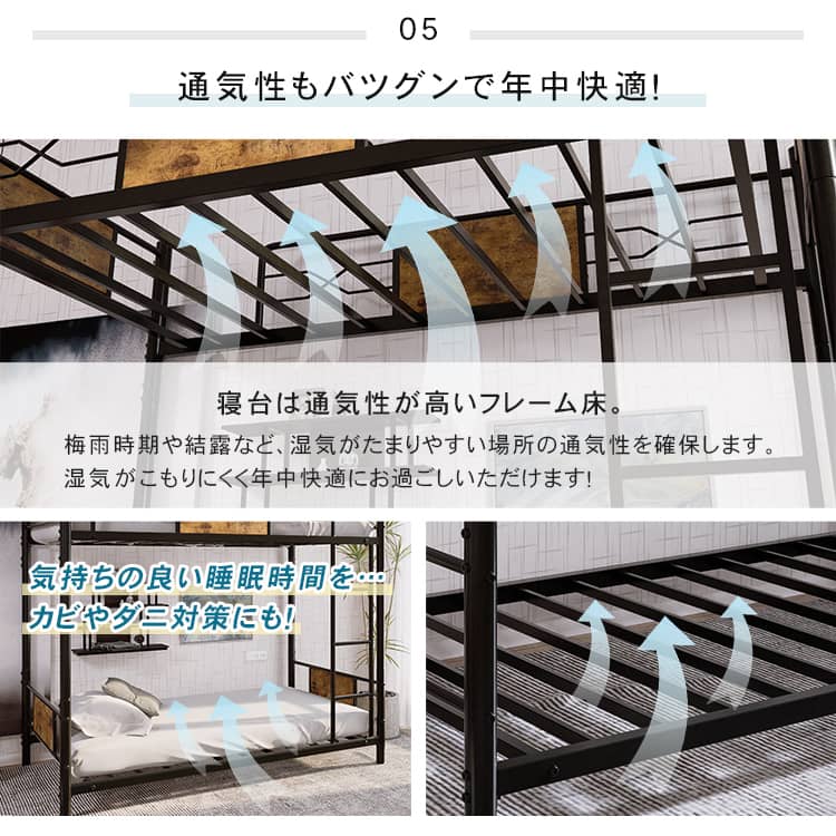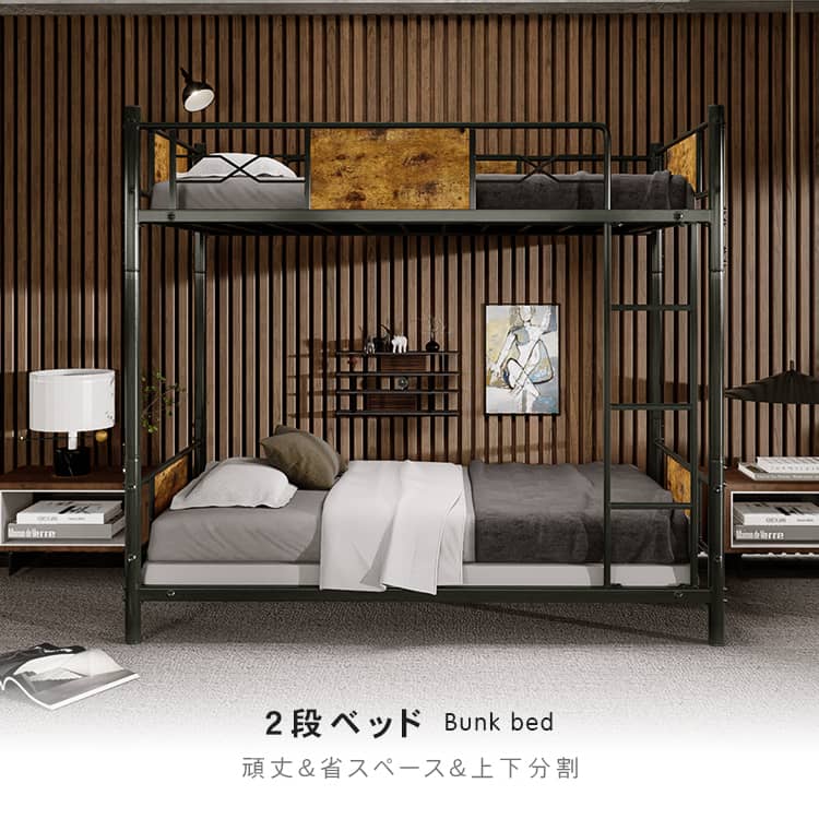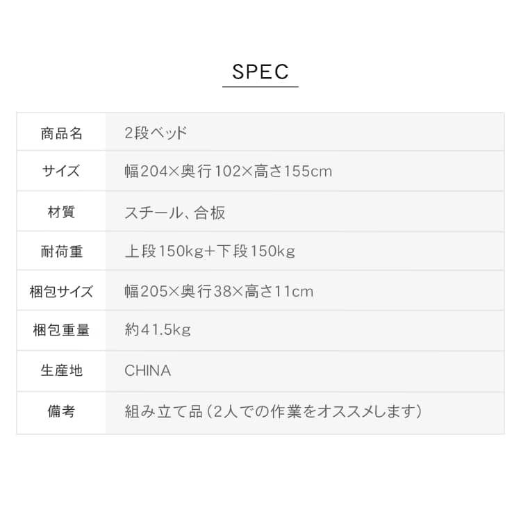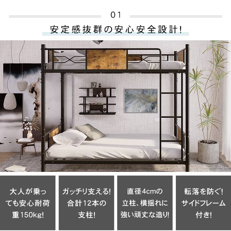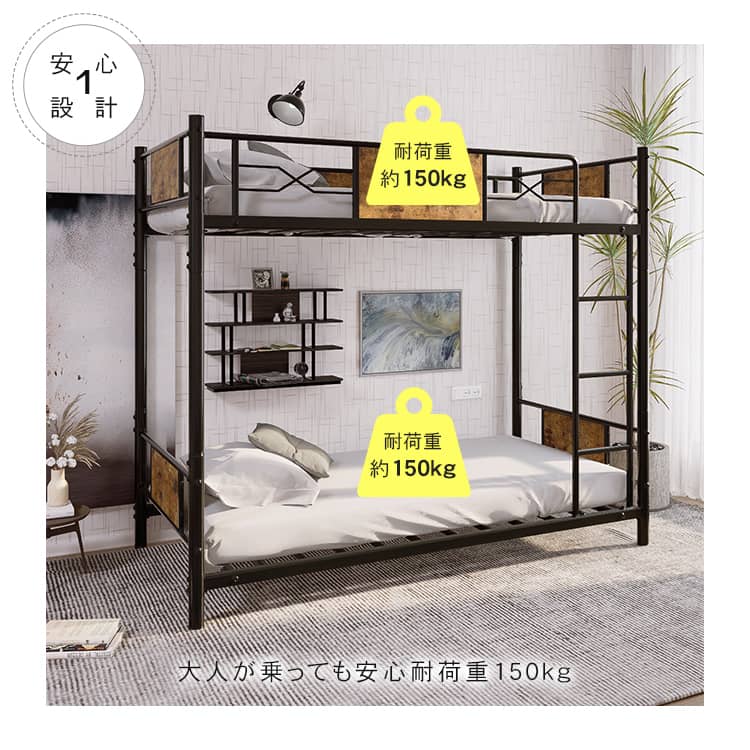 | おすすめのポイント | 1.寝床は合計12本の支柱を使って、安心・安全の強度。 2.しっかり支える耐荷重150kg。 3.サイドフレーム付き!布団もずれ落ちない!転落防止! 4.上下分割構造、シングルベッドとしても使用できるタイプ。 5.省スペース設計で、部屋を広々と見えます。 6.ベッド下には高さ16×横195cmの収納スペースあり、日用品などまとめてスッキリ。 7.通気性も抜群で年中快適に過ごせます。 8.絶妙な異素材の組み合わせを楽しめる。 9.安全な角丸加工、お子様のいるご家庭も安心してご使用頂けます。 |
