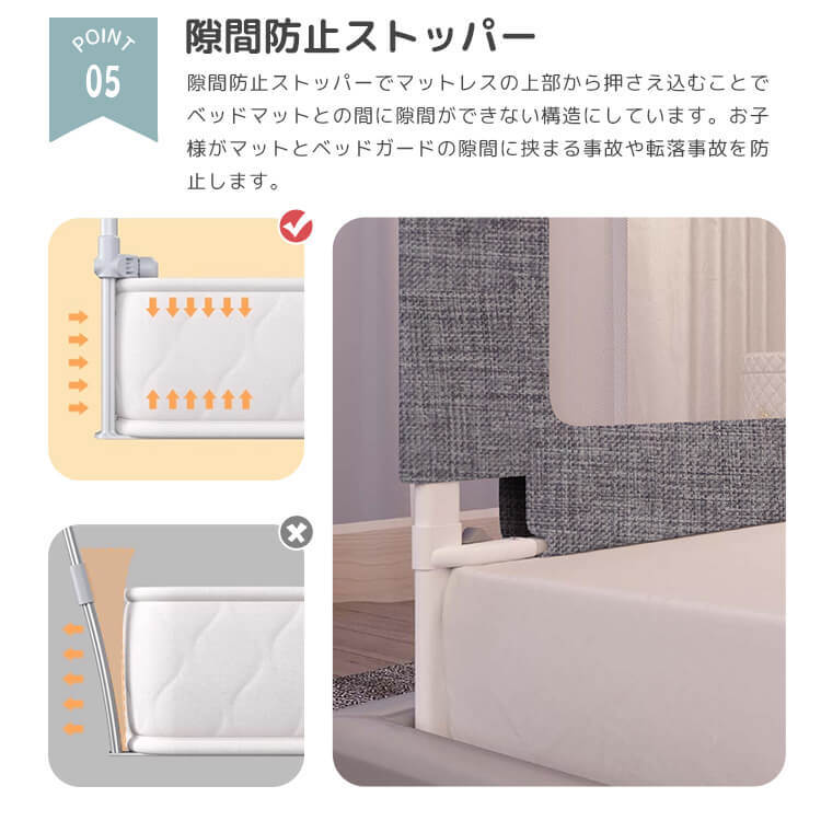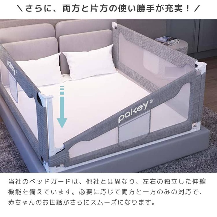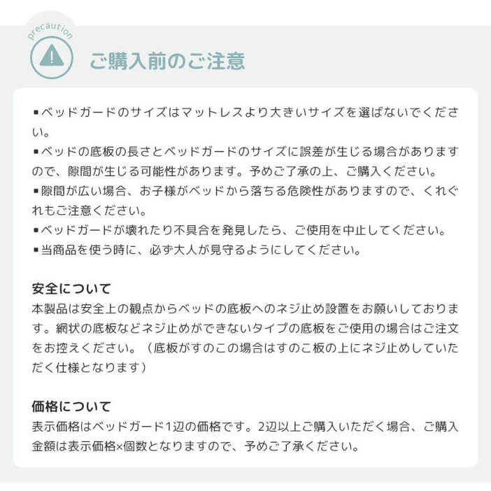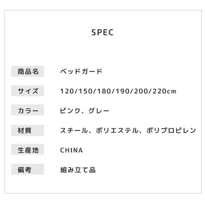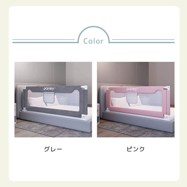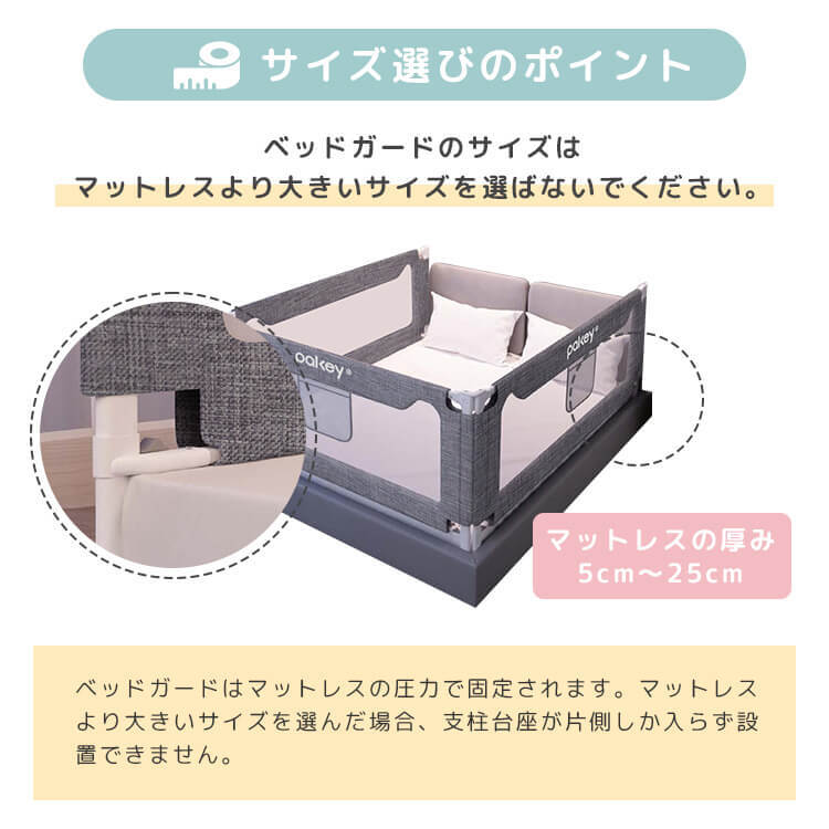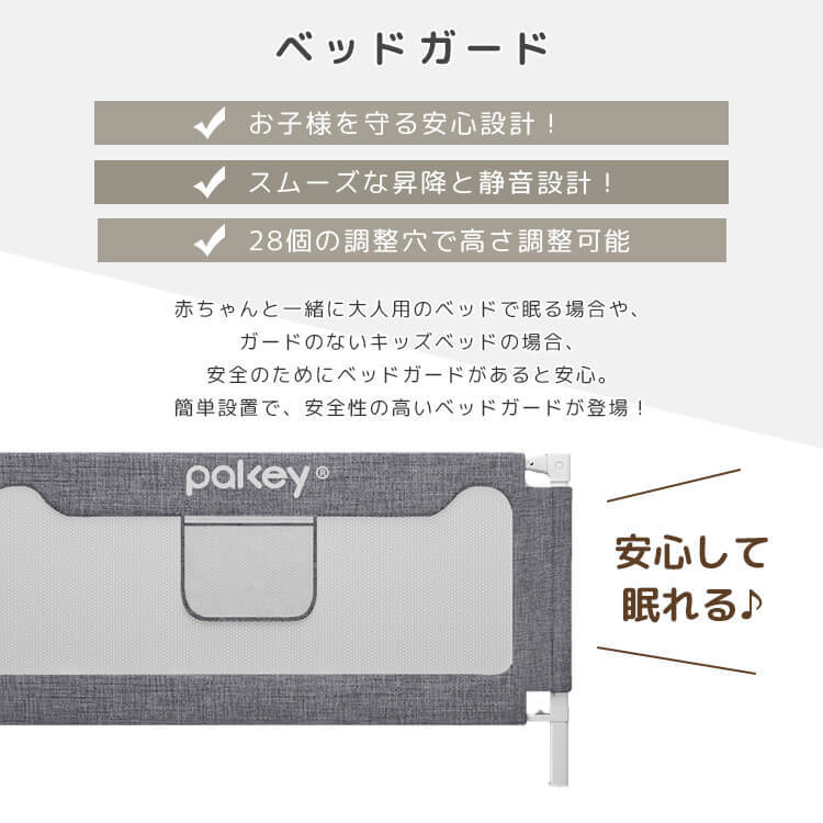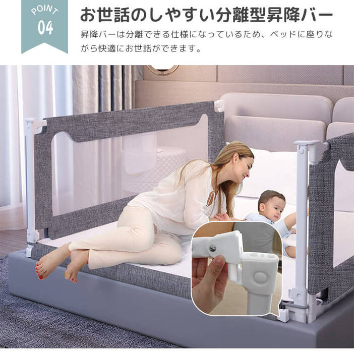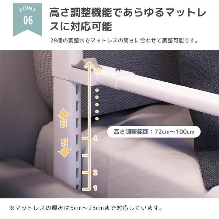 | おすすめのポイント | ■転落防止設計 高さ調節のボタンはダブルスイッチ式を採用。お子様による誤操作を防止できます。 ■安心・安全な素材 高強度で耐摩擦性・速乾性の高いポリエステルを使用。洗濯機の手洗いモードで洗濯可能なので、清潔にご使用いただけます。※ネットをご使用ください。 メッシュ部分は通気性に優れ、見通しも良いため、お子様にとってはもちろん、おうちの方にとっても安心です。 ■高さ調節機能 24個の調節穴で、高さ72~100cmまで調節可能。 ■ご使用のマットレスのサイズに応じたサイズを選べます。 (120/150/180/190/200/220cm) |