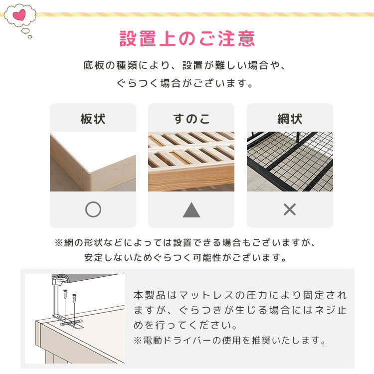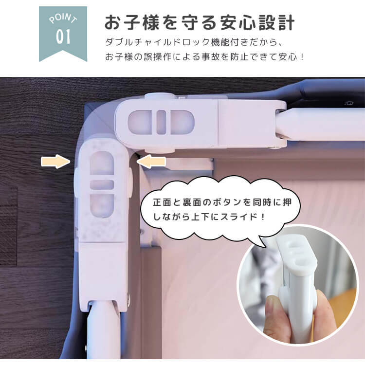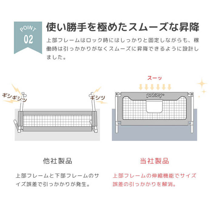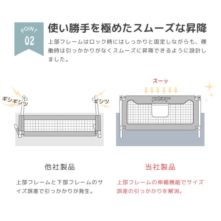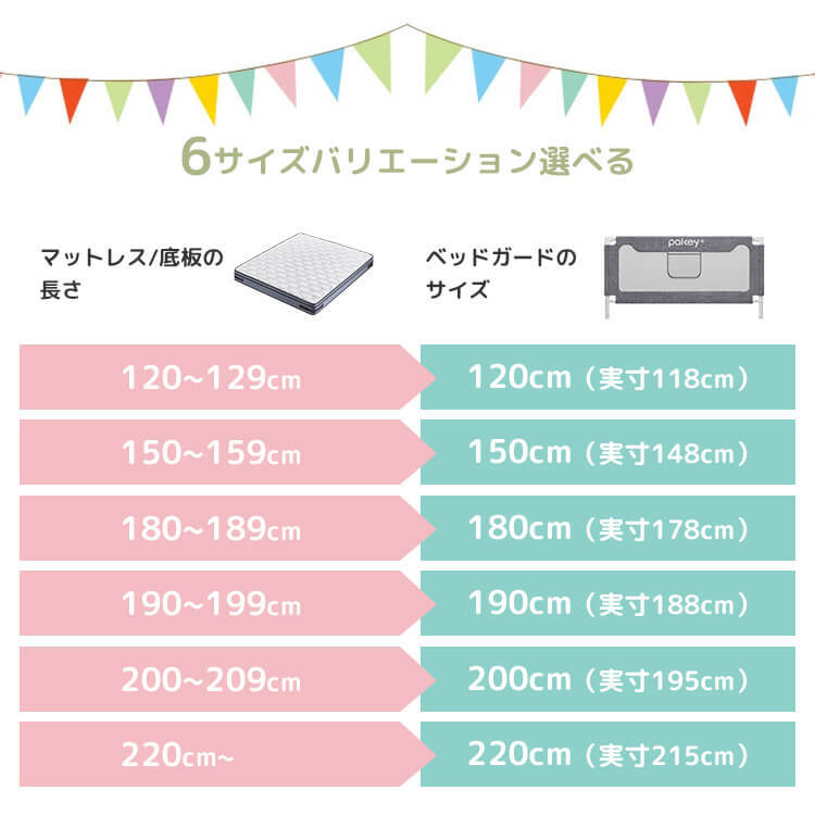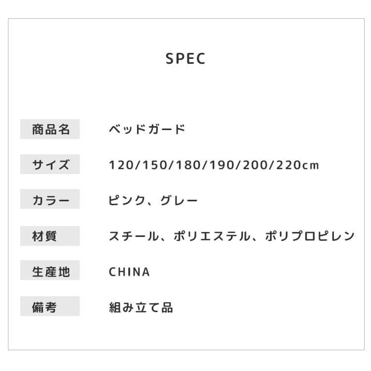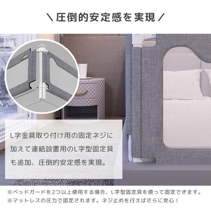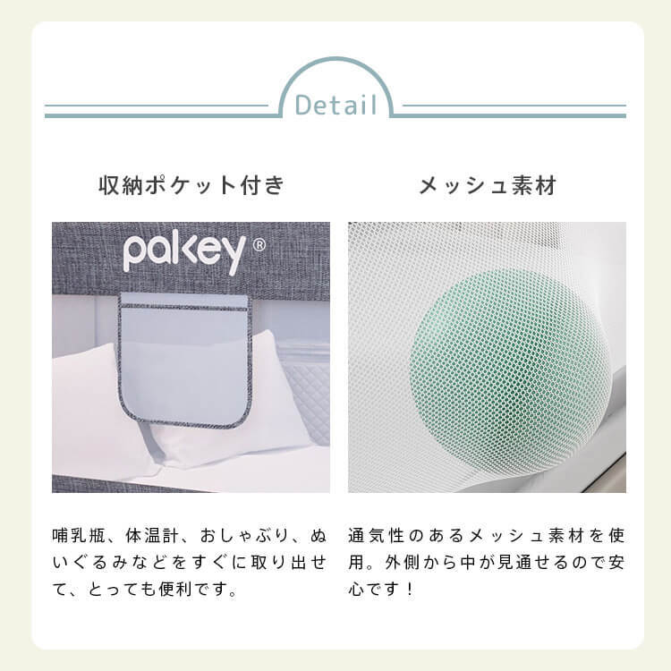 | おすすめのポイント | ■転落防止設計 高さ調節のボタンはダブルスイッチ式を採用。お子様による誤操作を防止できます。 ■安心・安全な素材 高強度で耐摩擦性・速乾性の高いポリエステルを使用。洗濯機の手洗いモードで洗濯可能なので、清潔にご使用いただけます。※ネットをご使用ください。 メッシュ部分は通気性に優れ、見通しも良いため、お子様にとってはもちろん、おうちの方にとっても安心です。 ■高さ調節機能 24個の調節穴で、高さ72~100cmまで調節可能。 ■ご使用のマットレスのサイズに応じたサイズを選べます。 (120/150/180/190/200/220cm) |