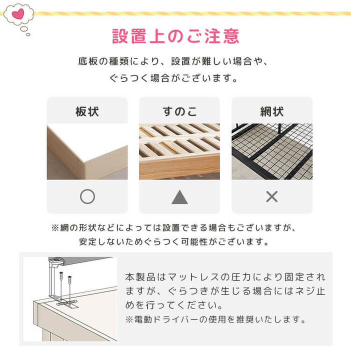 | 注意事項 | ■お客様組み立て品です。 ■ご購入頂く前に商品サイズ、必要な搬入間口のサイズ、設置する場所までのルートや出入口の幅・高さを十分にご確認ください。 確認方法はこちらへ 【色・サイズについて】 ◆ご覧頂いている商品の写真につきましては、できるだけ実物の色に近くなるように努めておりますが、お使いの環境(モニター、ブラウザ等)の違いにより、色の見え方・素材感が実物と若干異なる場合がございます。 ◆若干の個体差がある事から、表記と多少の差異が生じることがあります。 【納期について】 ◆納期の詳細は、各商品・各カラー毎に記載しておりますのでご確認下さい。 ◆納期の余裕を持ったご注文をお願い致します。 (一部地域についてお届けできない場合がございます。) |