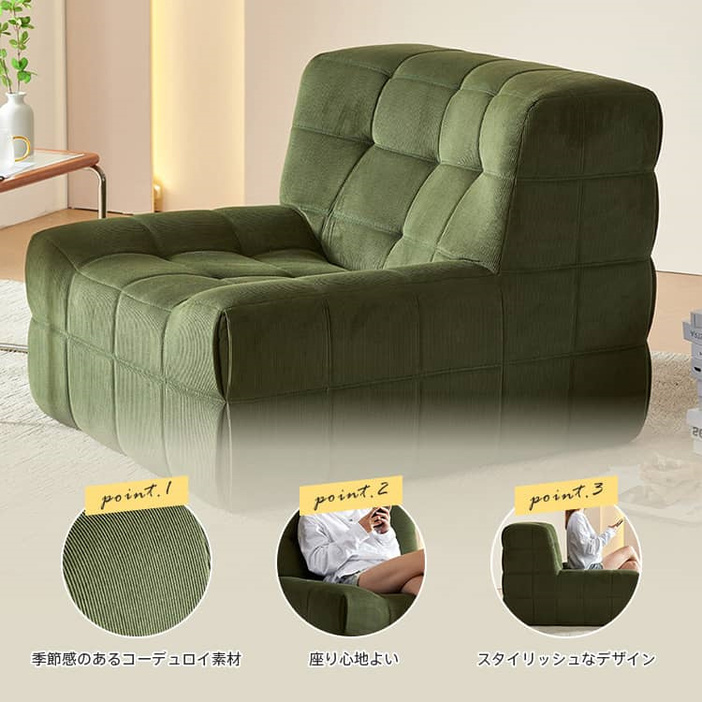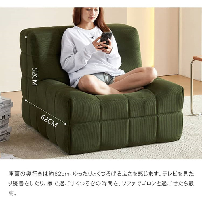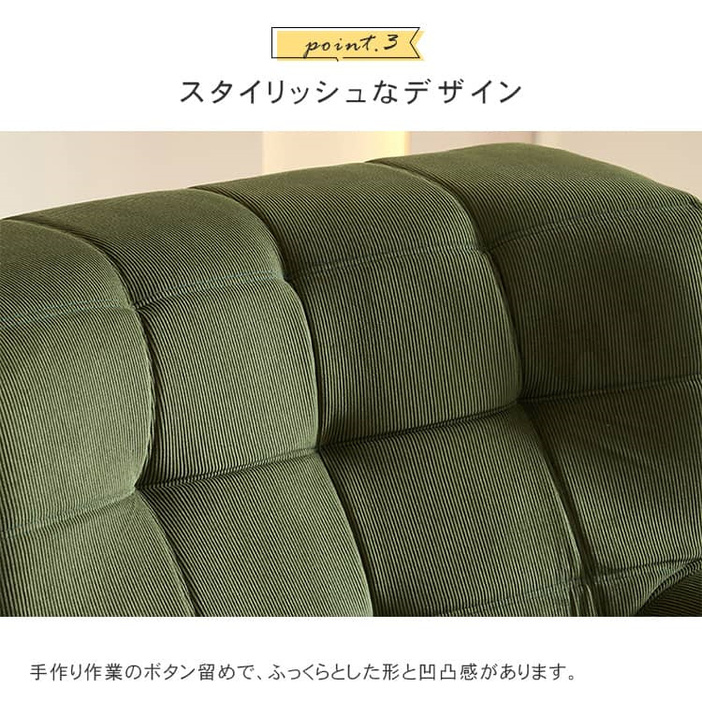| おすすめのポイント | ■座面の奥行きは約62cm。深くも浅くも腰掛けられ、気分に合わせて自由にリラックスできます。 ■ソファの内部フレームには厚みのある天然木が使用されており、そのため耐久性に優れた安全性の高い構造となっています。さらに、座面には十分な量の贅沢なクッションが詰められており、心地よい弾力と底付き感のない座り心地を実現しています。 ■背もたれにはクッション性の高い素材を使用し、体にフィットして全身でリラックスできます。 ■人間工学に基づいた設計で、体への負担を軽減してくれます。長時間座っても疲れません。 ■レトロで肌触りが良いコーデュロイ生地で、静電気もほこりも溜まりやすくないです。 ■背面まで美しいソファなので、お部屋のどこに置いても雰囲気を壊しません。 |