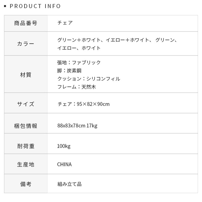 | 材質 | 張地:ファブリック 脚:炭素鋼 クッション:シリコンフィル フレーム:天然木 |