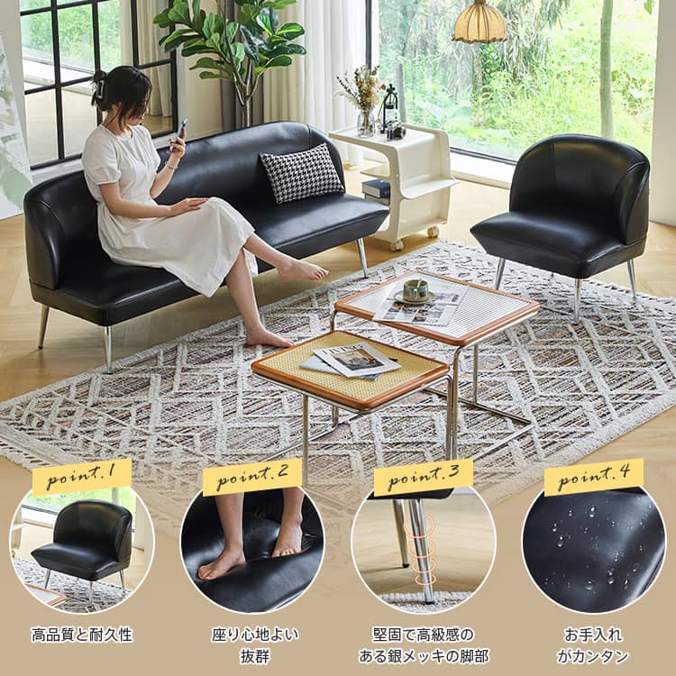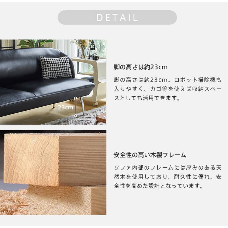 | 材質 | 張地:合成皮革 脚:スチール クッション:ウレタン、シリコンフィル フレーム:天然木 |