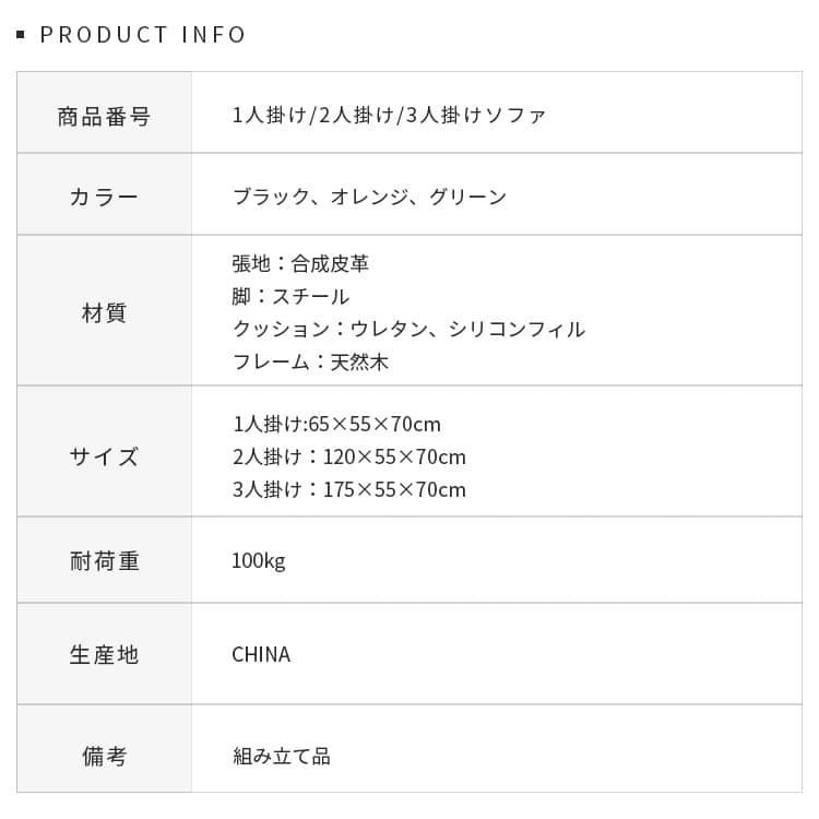 | 商品サイズ | 1人掛け:65×55×70cm 2人掛け:120×55×70cm 3人掛け:175×55×70cm |