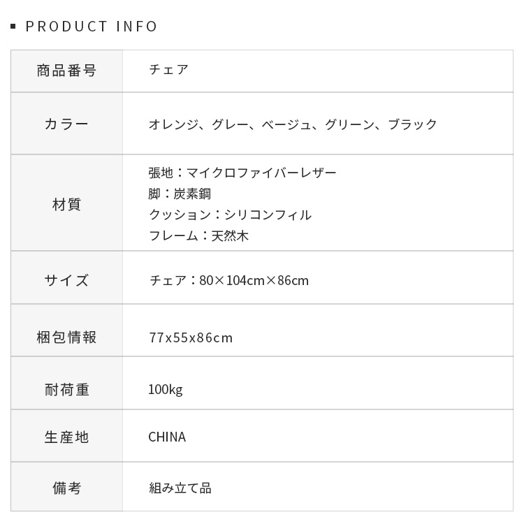 | 材質 | 張地:マイクロファイバーレザー 脚:炭素鋼 クッション:シリコンフィル フレーム:天然木 |