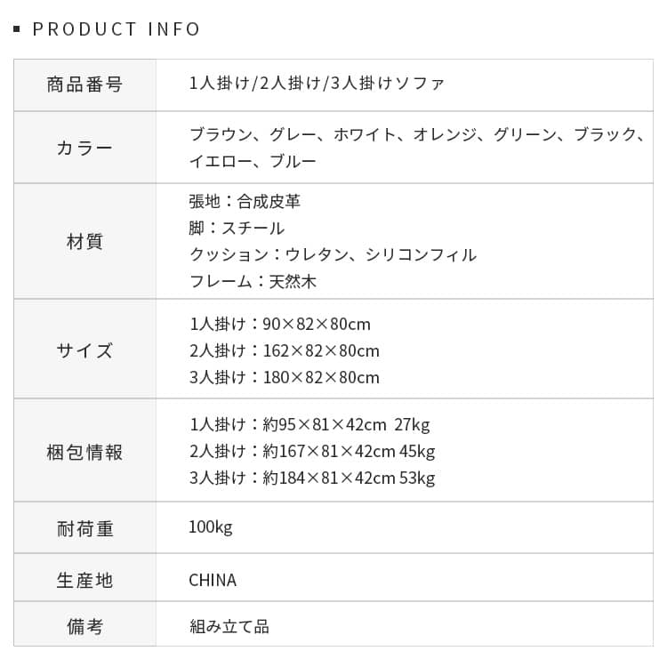 | 商品サイズ | 1人掛け:90×82×80cm 2人掛け:162×82×80cm 3人掛け:180×82×80cm |