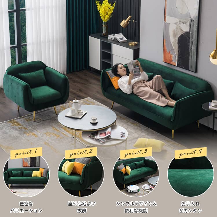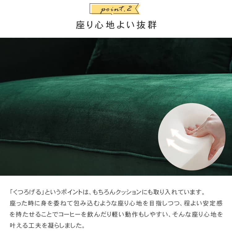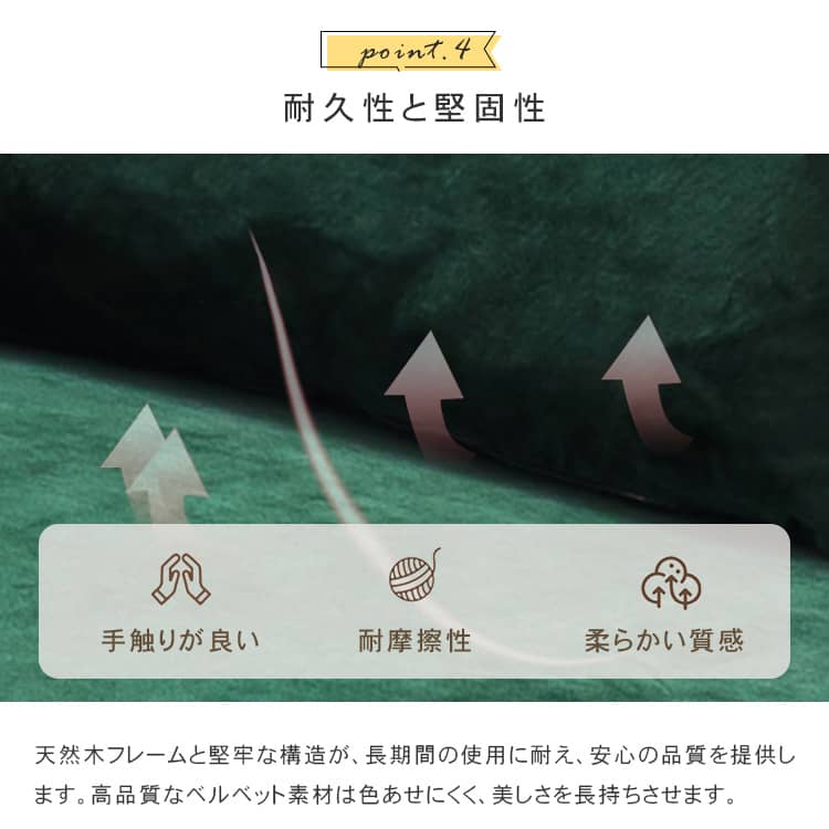 | 材質 | 張地:ベルベット 脚:スチール クッション:ウレタン、シリコンフィル フレーム:天然木 |