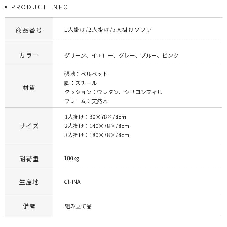| 商品サイズ | 1人掛け:80×78×78cm 2人掛け:140×78×78cm 3人掛け:180×78×78cm |