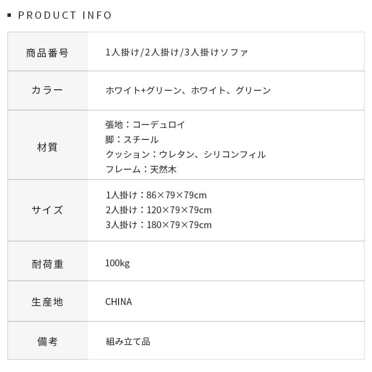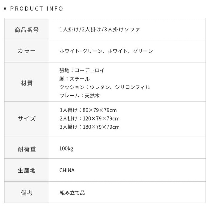 | 商品サイズ | 1人掛け:86×79×79cm 2人掛け:120×79×79cm 3人掛け:180×79×79cm |