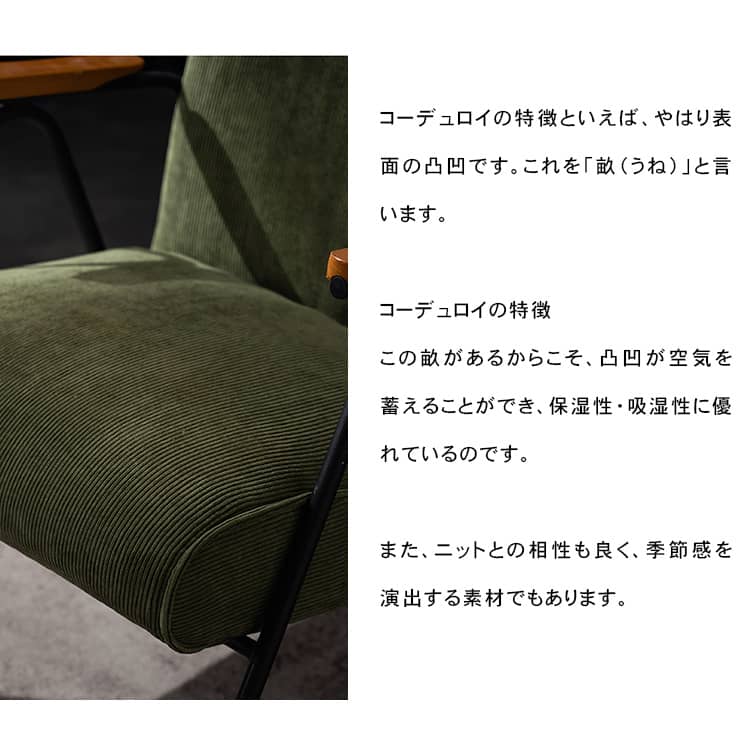 | 材質 | 張地:コーデュロイ 脚:スチール クッション:シリコンフィル フレーム:天然木 |
