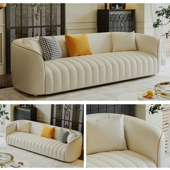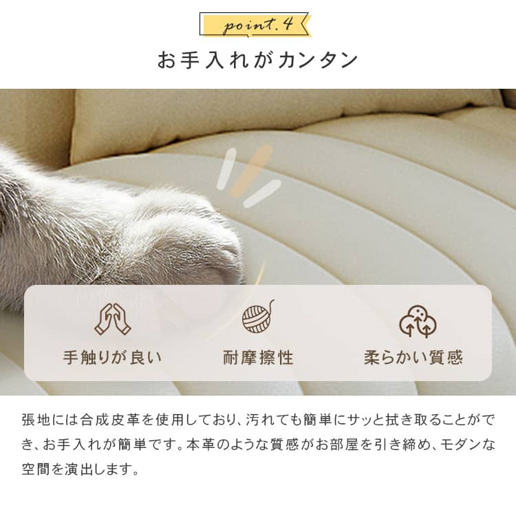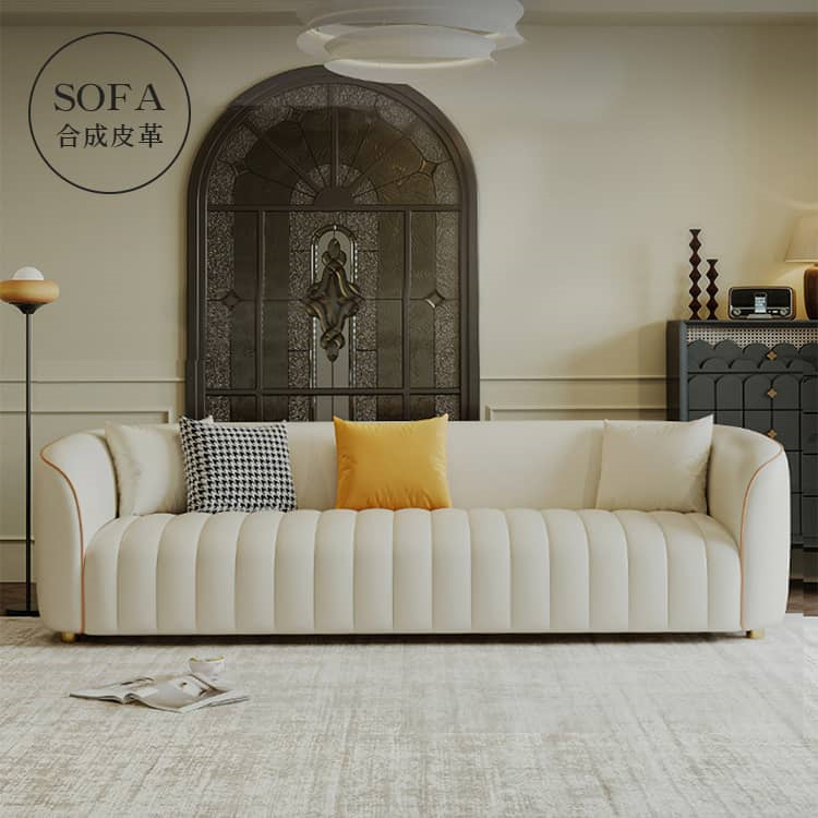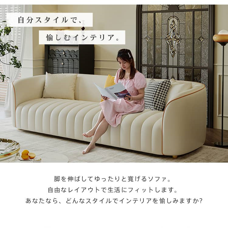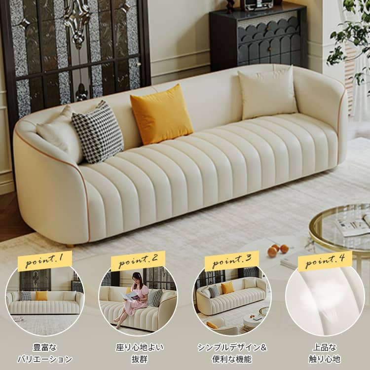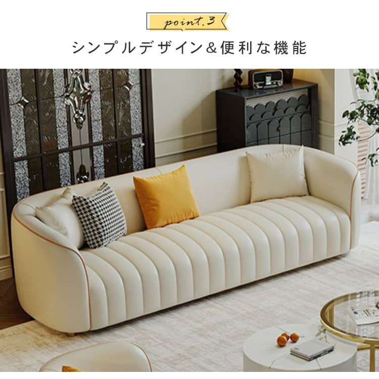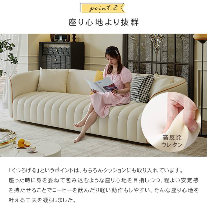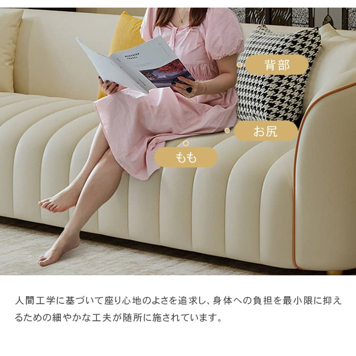 | おすすめのポイント | ■座面の奥行きは約55cm。深くも浅くも腰掛けられ、気分に合わせて自由にリラックスできます。 ■ソファの内部フレームには厚みのある天然木が使用されており、そのため耐久性に優れた安全性の高い構造となっています。さらに、座面には十分な量の贅沢なクッションが詰められており、心地よい弾力と底付き感のない座り心地を実現しています。 ■背もたれにはクッション性の高い素材を使用し、体にフィットして全身でリラックスできます。 ■圧迫感のないシンプルなデザインは、家族や友人と過ごすリビングを洗練された寛ぎの空間に演出します。 ■人間工学に基づいた設計で、体への負担を軽減してくれます。長時間座っても疲れません。 ■張地には合成皮革を採用しており、合成皮革は通常、汚れや摩耗に強く、水や汚れに対する耐性があります。これにより、日常の使用や家庭でのペットや子供のいる家庭に適しています。 ■背面まで美しいソファなので、お部屋のどこに置いても雰囲気を壊しません。 |