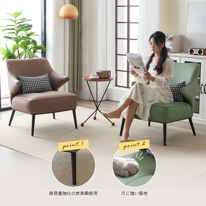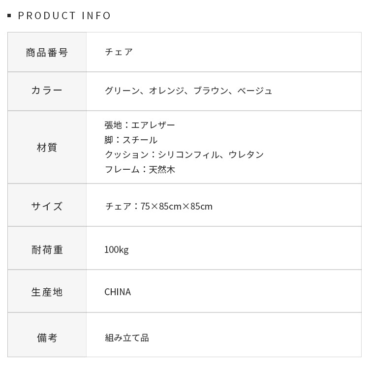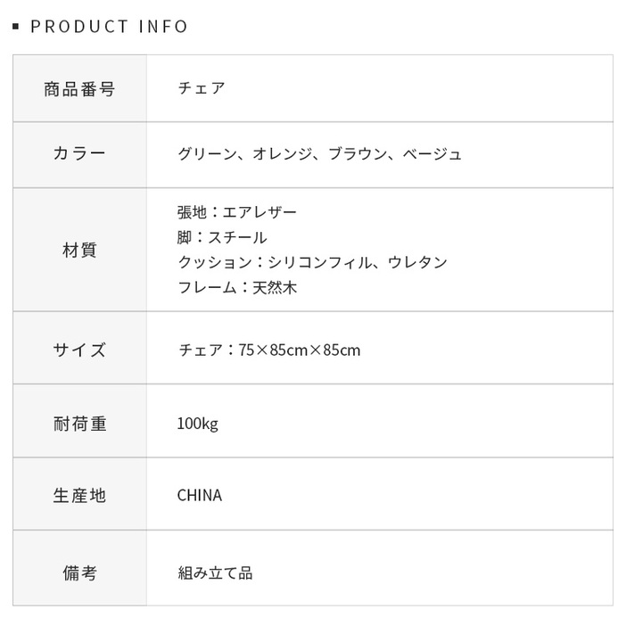 | 材質 | 張地:エアレザー 脚:スチール クッション:シリコンフィル、ウレタン フレーム:天然木 |