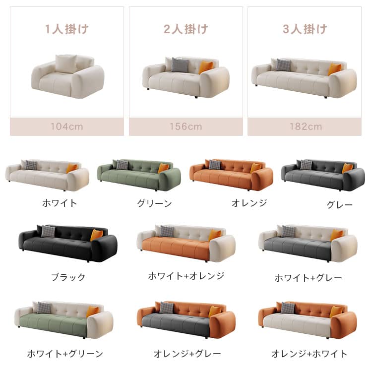| サイズ | ■1人掛け:約104×90×70cm ■2人掛け:約156×90×70cm ■3人掛け:約182×90×70cm |