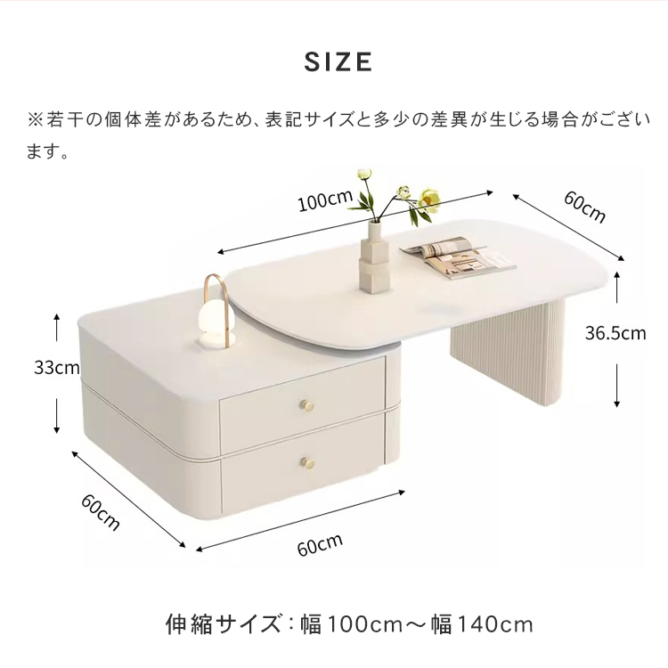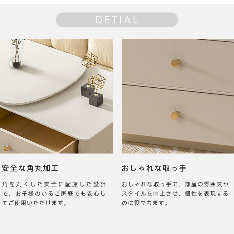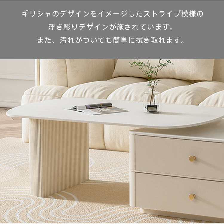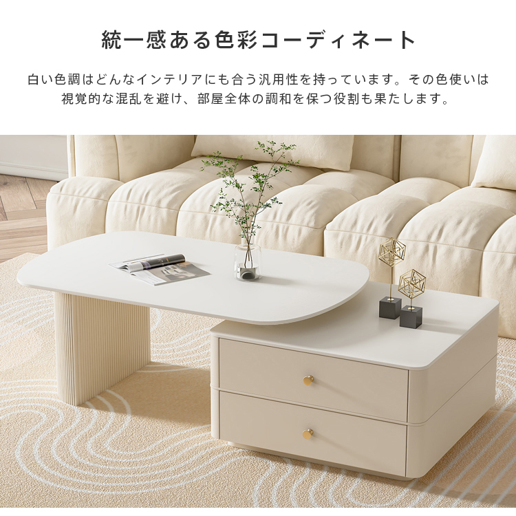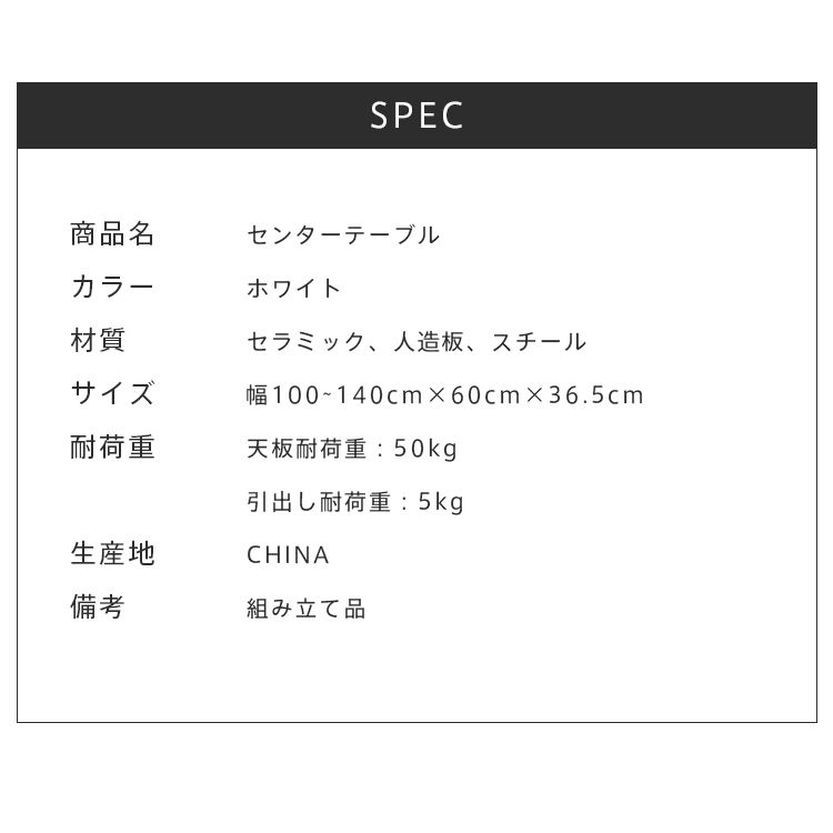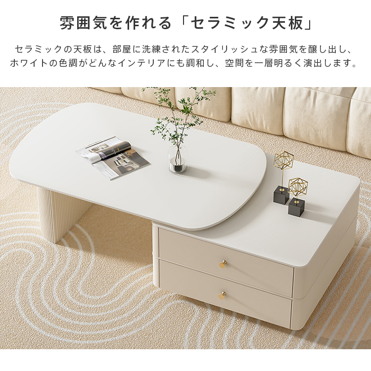 | おすすめのポイント | ■角を丸くした安全に配慮した設計で、お子様のいるご家庭でも安心してご使用いただけます。 ■おしゃれな取っ手で、部屋の雰囲気やスタイルを向上させ、個性を表現するのに役立ちます。 ■お好みの幅や部屋の広さに合わせて、自由自在に調整可能 ■セラミック天板は耐熱性、耐摩耗性、耐汚性に優れた素材です。 ■ホワイトの色調がどんなインテリアにも調和し、空間を一層明るく演出します。 |