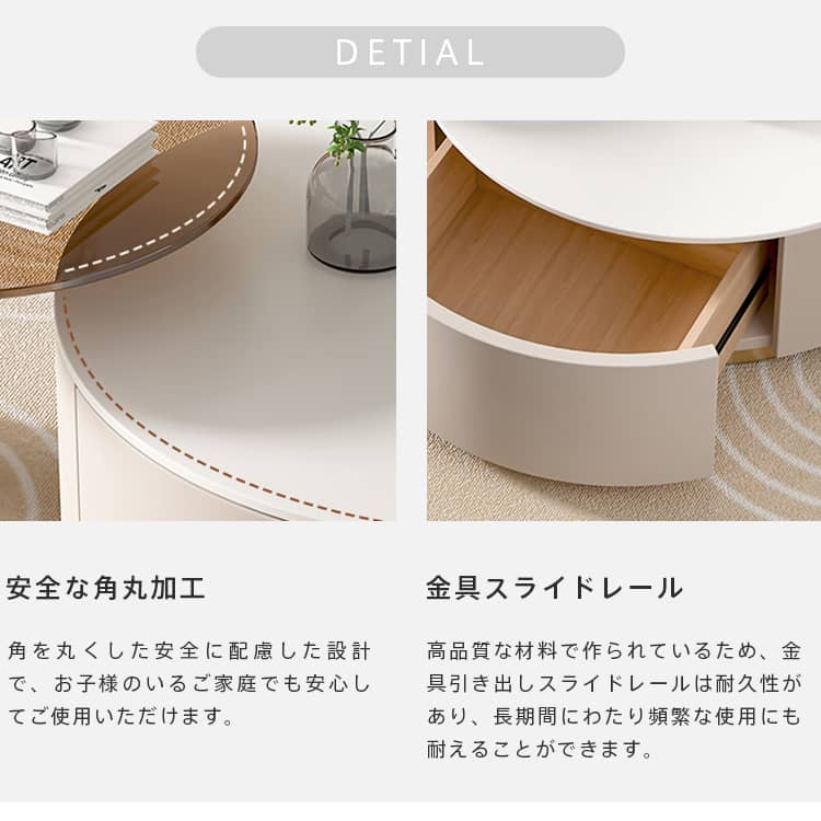 | おすすめのポイント | ■角を丸くした安全に配慮した設計で、お子様のいるご家庭でも安心してご使用いただけます。 ■天板には丸みを帯びた優しいデザイン ■ホワイトの色調がどんなインテリアにも調和し、空間を一層明るく演出します。 ■セラミック天板は耐熱性、耐摩耗性、耐汚性に優れた素材です。 ■側から開けられる引き出し付き、収納便利です。 |