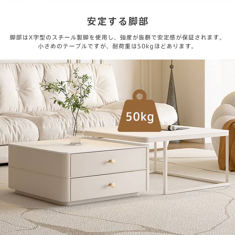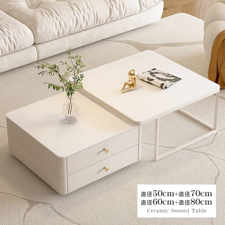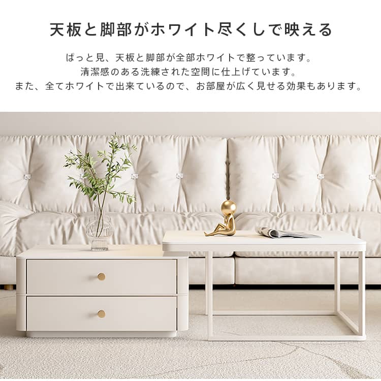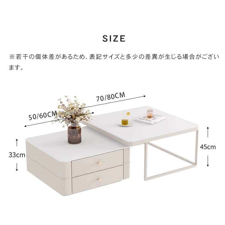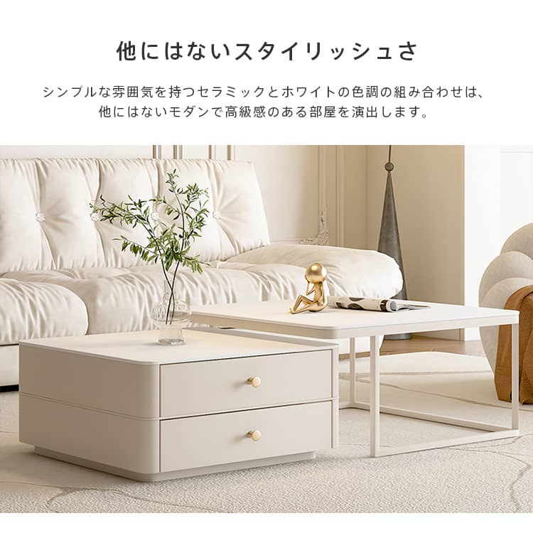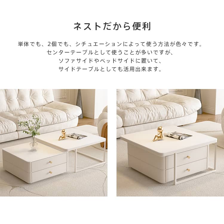 | おすすめのポイント | ■角を丸くした安全に配慮した設計で、お子様のいるご家庭でも安心してご使用いただけます。 ■置くだけでお部屋のアクセントに!憧れの海外インテリアを手軽に楽しめます。上品で高級感溢れる正方形モダンデザインでお部屋にも馴染みます。 ■ホワイトの色調がどんなインテリアにも調和し、空間を一層明るく演出します。 ■本や雑貨をしっかりと収納できる引き出しが付いています。リビング周りの物をスッキリと整理整頓し、すっきりとした空間を作ることができます。 ■センターテーブルやサイドテーブルとして活躍。大小テーブルを並べれば広々と使えます。もちろん1個ずつ単体でのご使用も可能です。シーンに合わせたレイアウトをお楽しみいただけます。 |