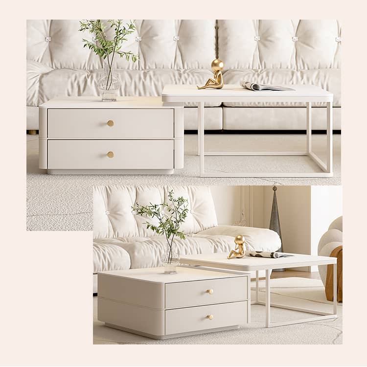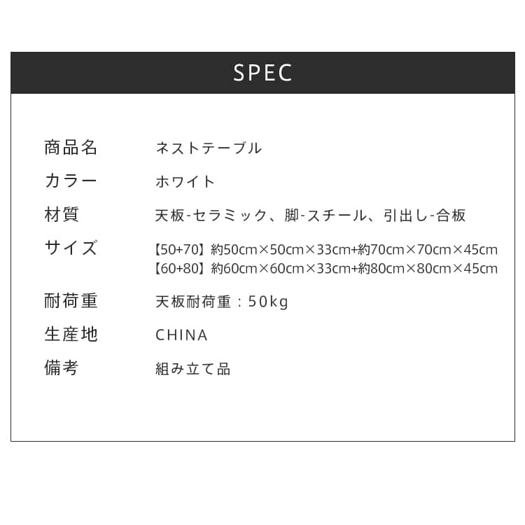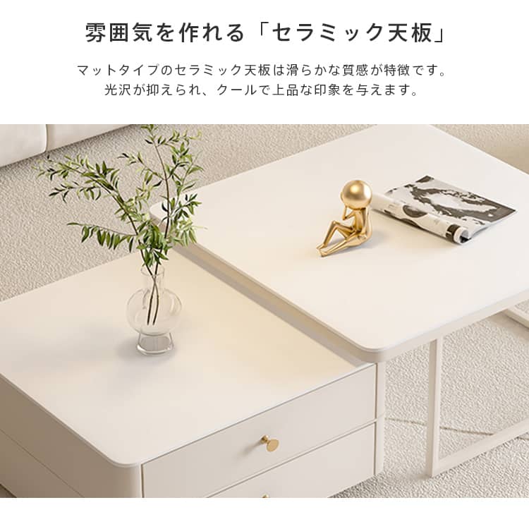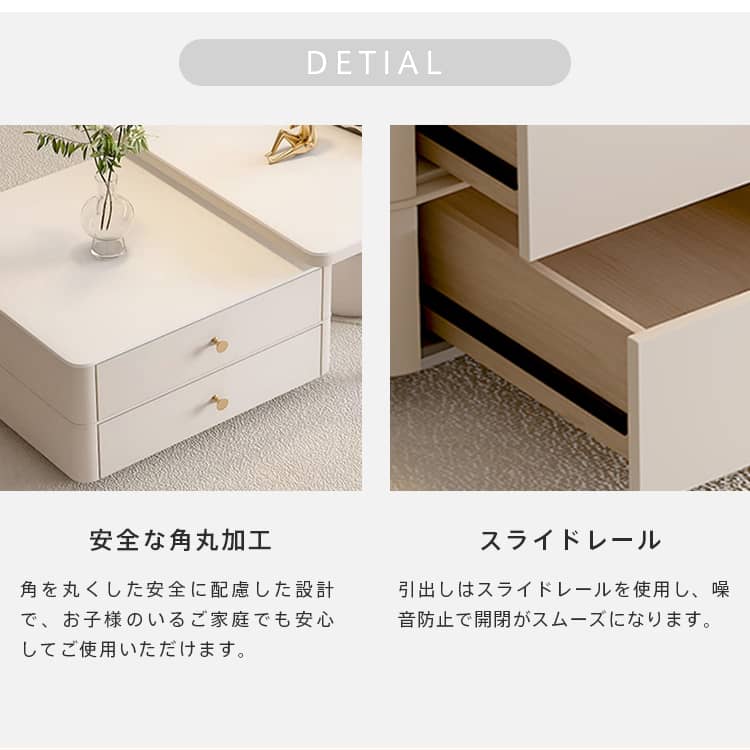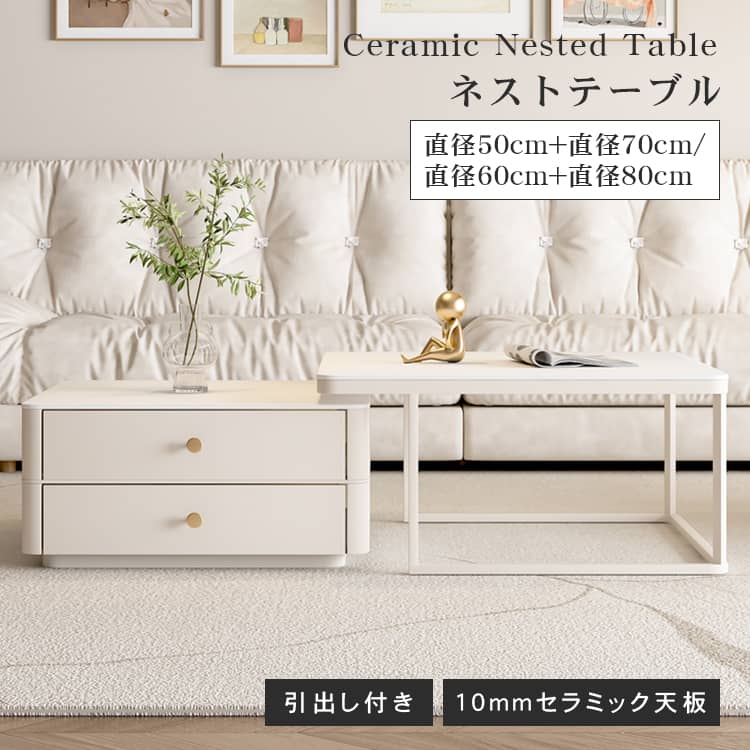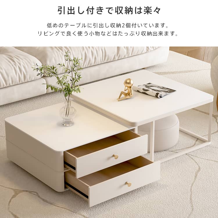 | おすすめのポイント | ■角を丸くした安全に配慮した設計で、お子様のいるご家庭でも安心してご使用いただけます。 ■置くだけでお部屋のアクセントに!憧れの海外インテリアを手軽に楽しめます。上品で高級感溢れる正方形モダンデザインでお部屋にも馴染みます。 ■ホワイトの色調がどんなインテリアにも調和し、空間を一層明るく演出します。 ■本や雑貨をしっかりと収納できる引き出しが付いています。リビング周りの物をスッキリと整理整頓し、すっきりとした空間を作ることができます。 ■センターテーブルやサイドテーブルとして活躍。大小テーブルを並べれば広々と使えます。もちろん1個ずつ単体でのご使用も可能です。シーンに合わせたレイアウトをお楽しみいただけます。 |