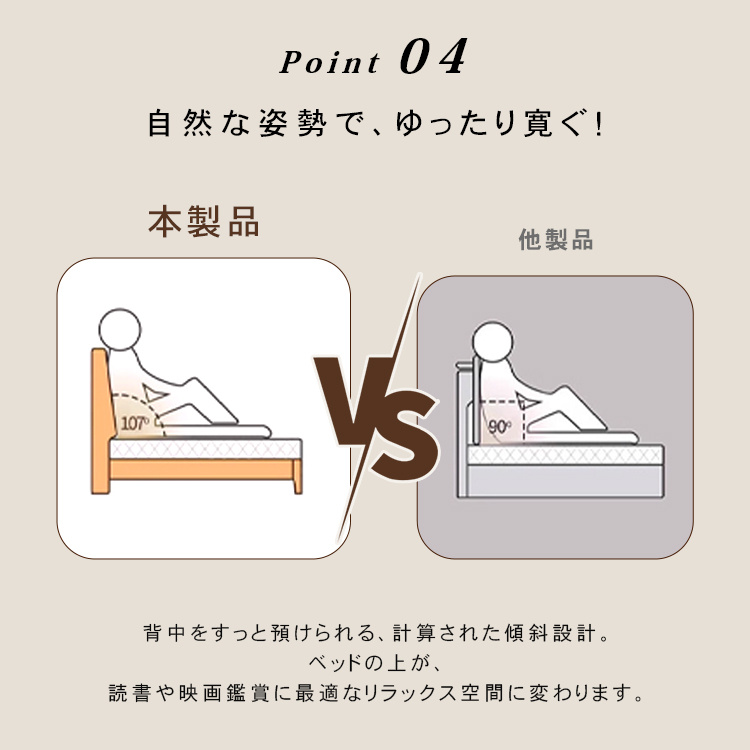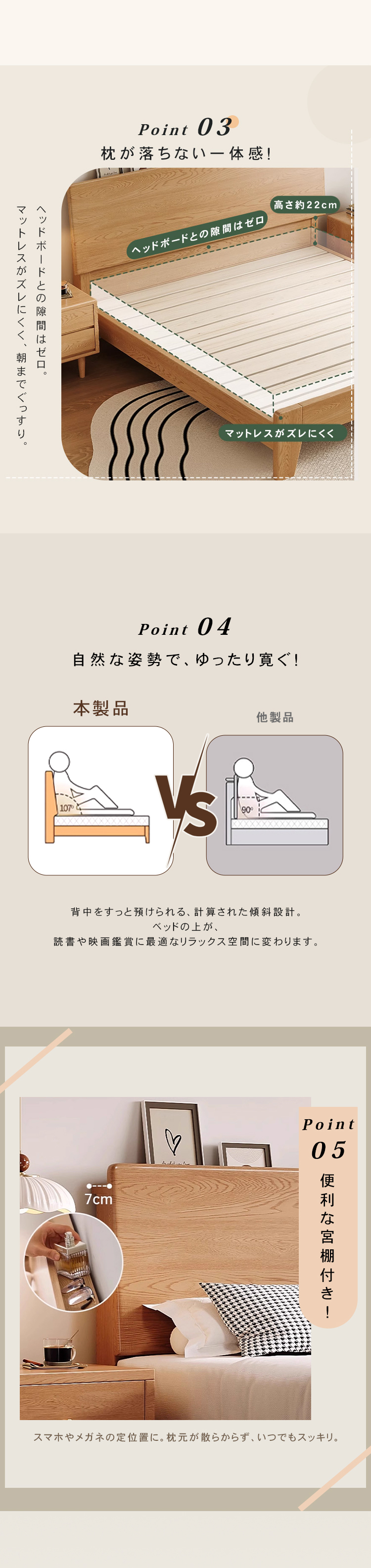 | おすすめのポイント | ■モダンで洗練された空間を演出してくれます。 ■上品で優美さ際立つヘッドボード。 ■人間工学設計で、体にフィットする形状と角度。 ■掃除機や掃除ロボットが入りやすい脚の高さ。 ■通気性に優れたベッドは、マットレスの湿気対策に優れています。 |