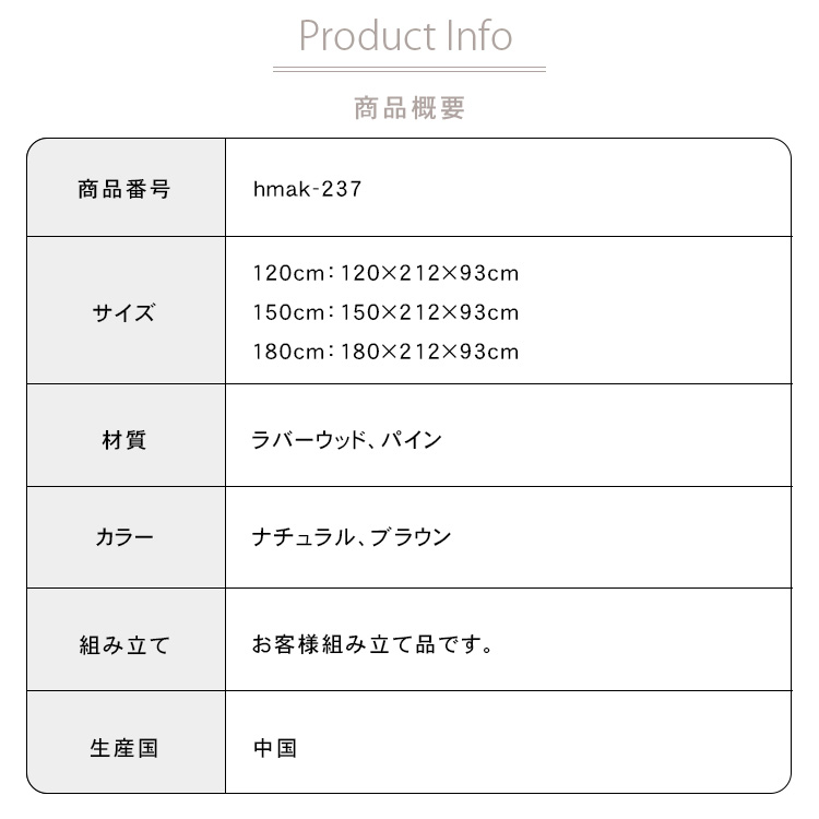 | 商品サイズ | ベッド ■横幅120/150/180×奥行き212×高さ93cm |