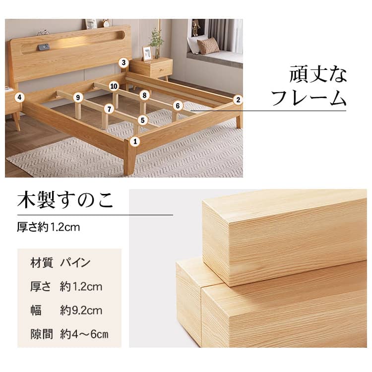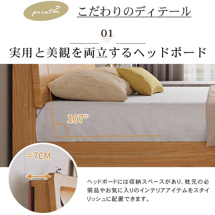 | おすすめのポイント | ■モダンで洗練された空間を演出してくれます。 ■上品で優美さ際立つヘッドボード。 ■人間工学設計で、体にフィットする形状と角度。 ■掃除機や掃除ロボットが入りやすい脚の高さ。 ■通気性に優れたベッドは、マットレスの湿気対策に優れています。 |
