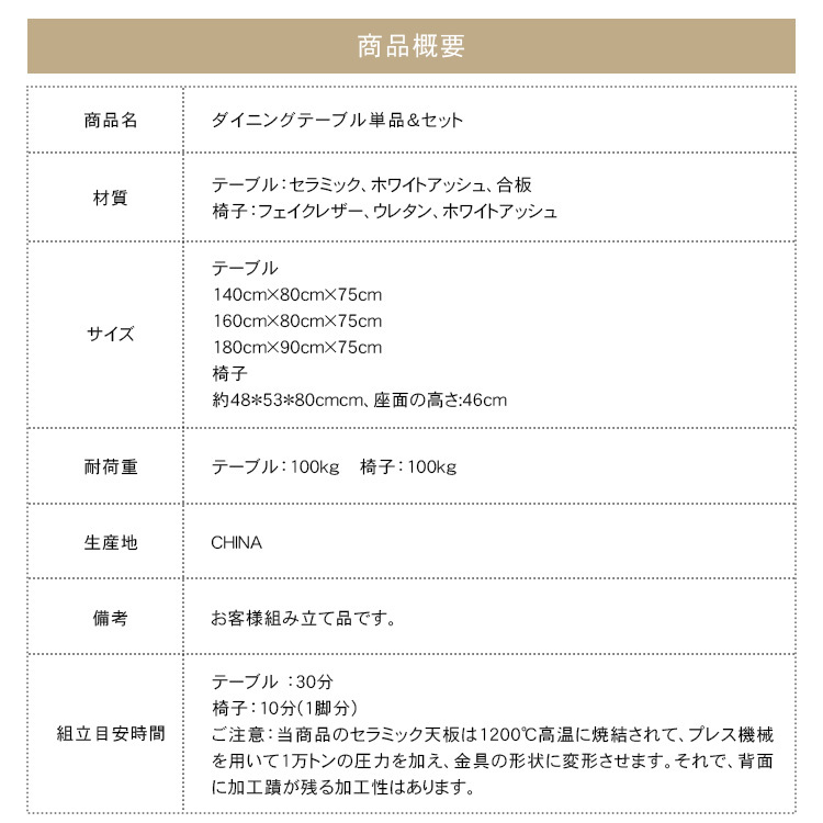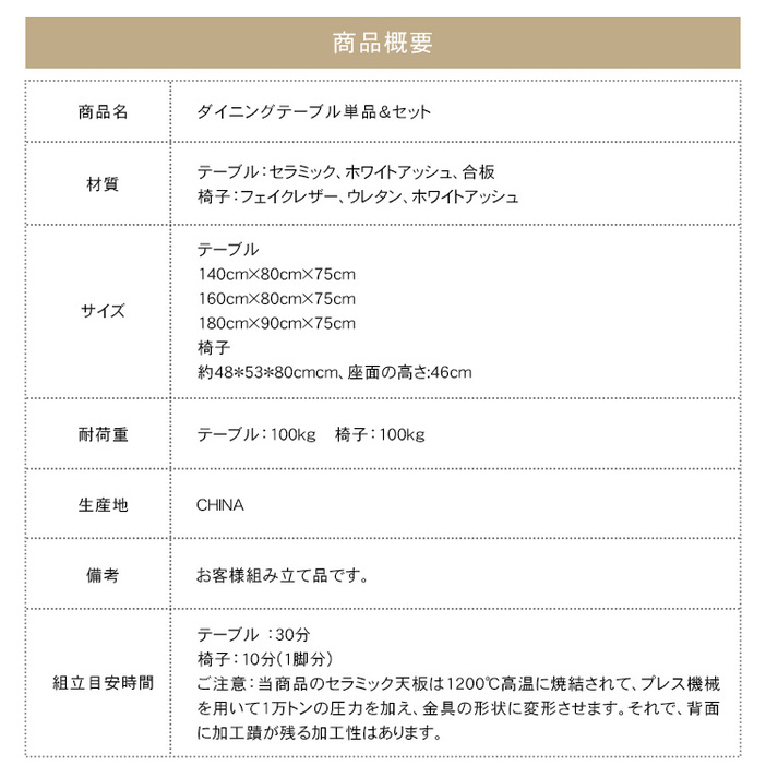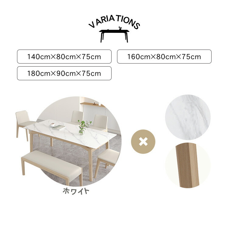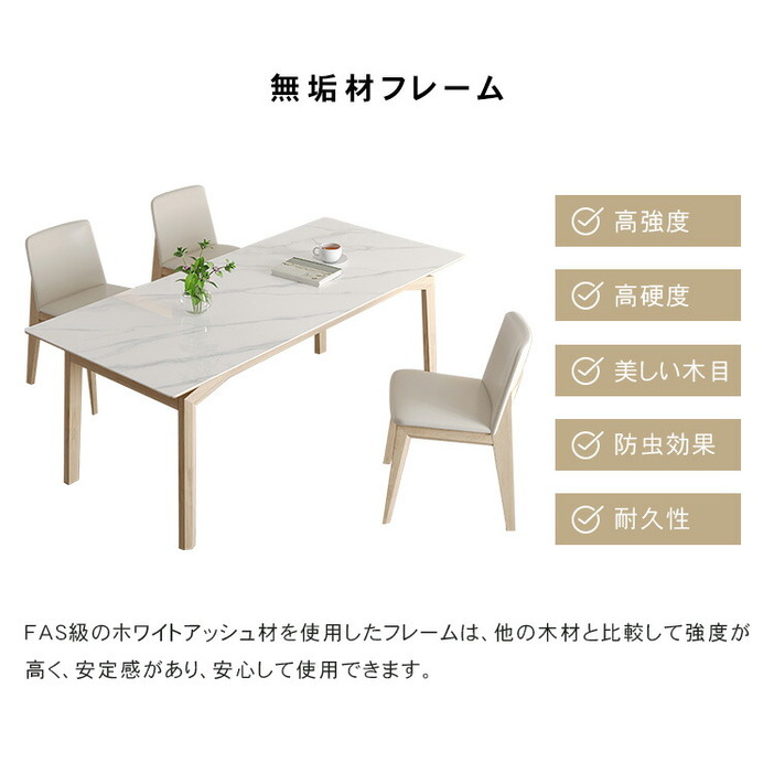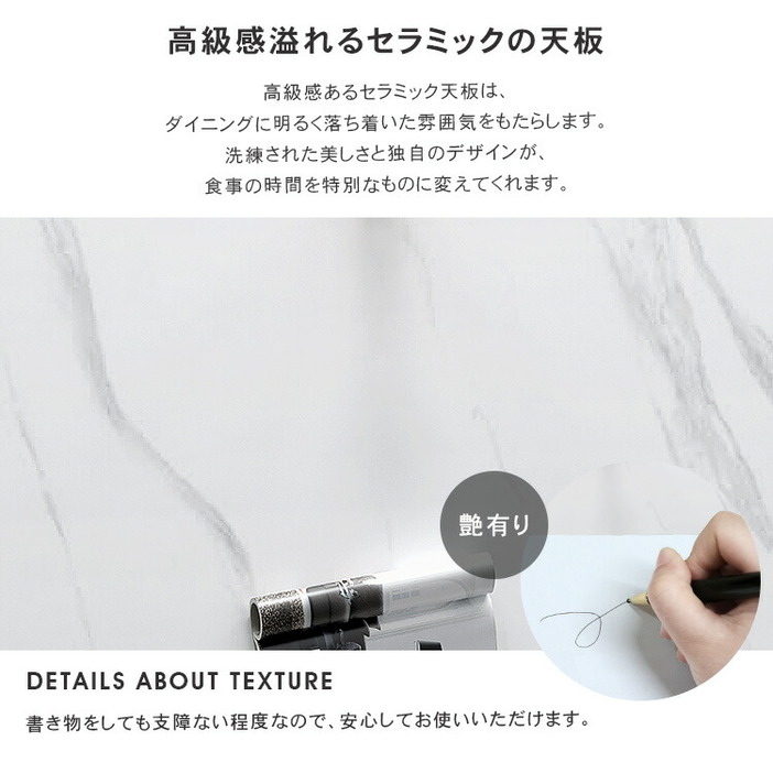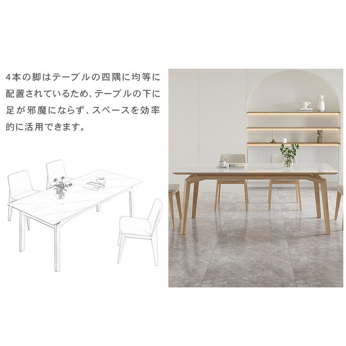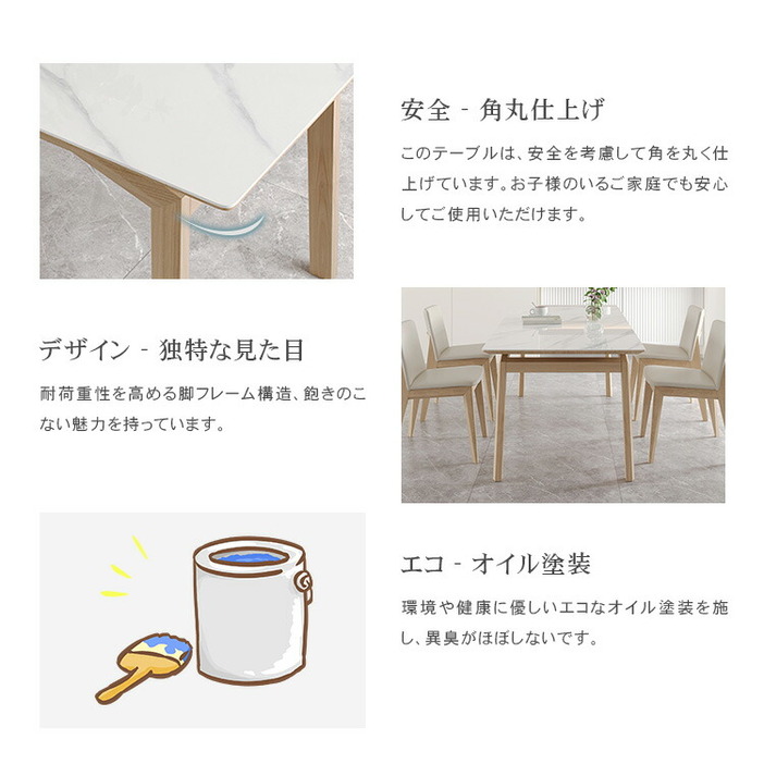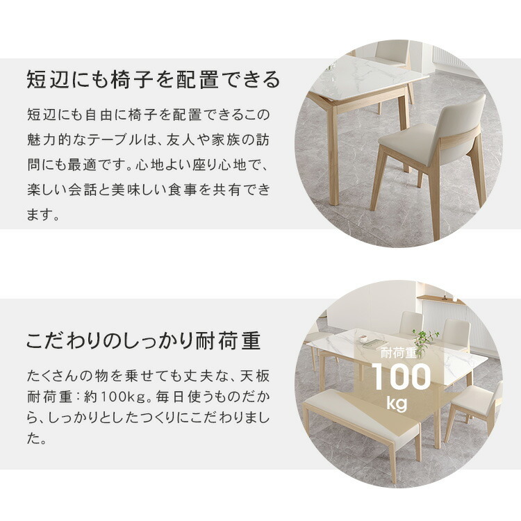 | おすすめのポイント | ■3サイズがご用意されており、お部屋の広さやテーブルの配置に合わせて最適な組み合わせをお選びいただけます。 ■短辺にも椅子を自由に配置できる魅力的なテーブル。友人や家族の訪問でも心配はありません 。 ■下部にゆとりがあり、足元に広々とした空間があるため、快適なダイニング空間を実現し、リラックスした時間を過ごせます。 ■テーブルの角を丸くした安全に配慮した設計で、お子様のいるご家庭でも安心してご使用いただけます。 ■セラミック天板は高級感があり、耐久性も備えています。美しさと実用性を兼ね備えています。 ■長方形のテーブルは、多くの場所に適応する柔軟性があります。狭いスペースにも置くことができ、壁に沿って配置することも可能です。 |