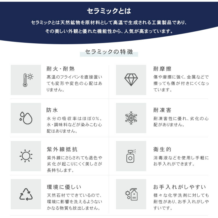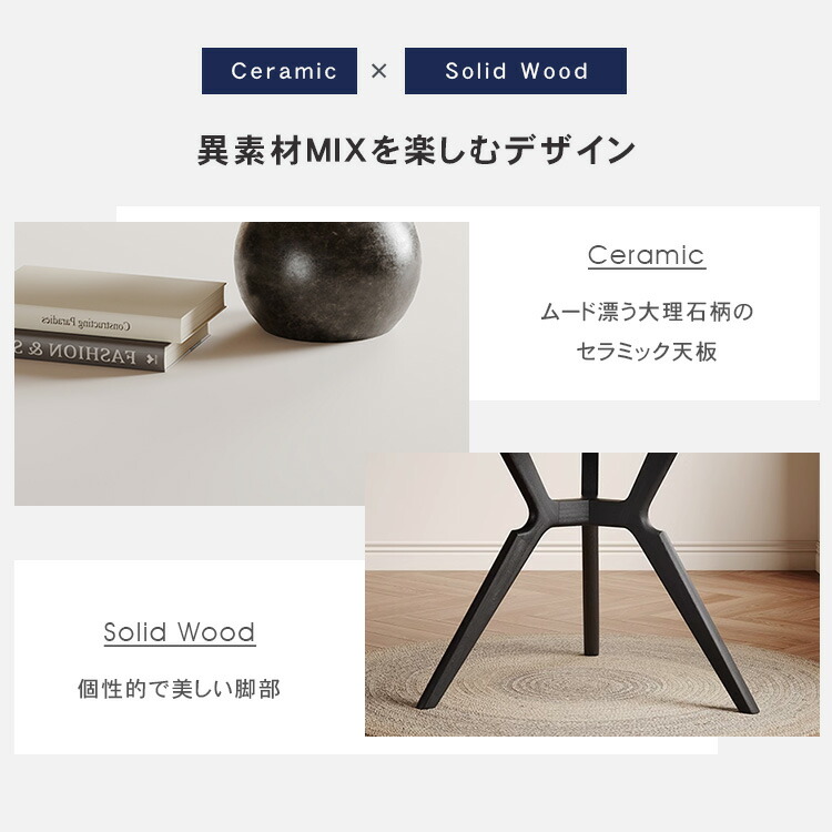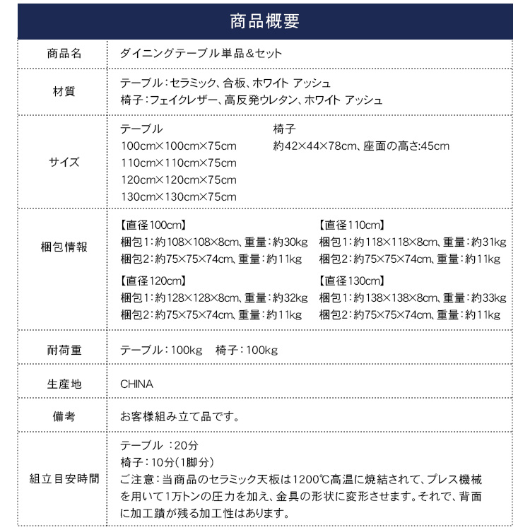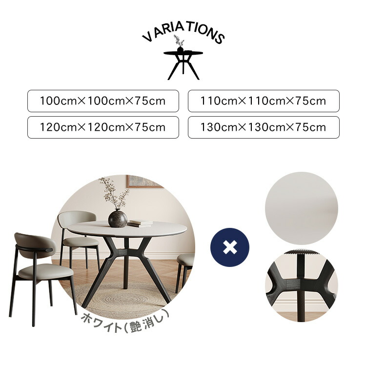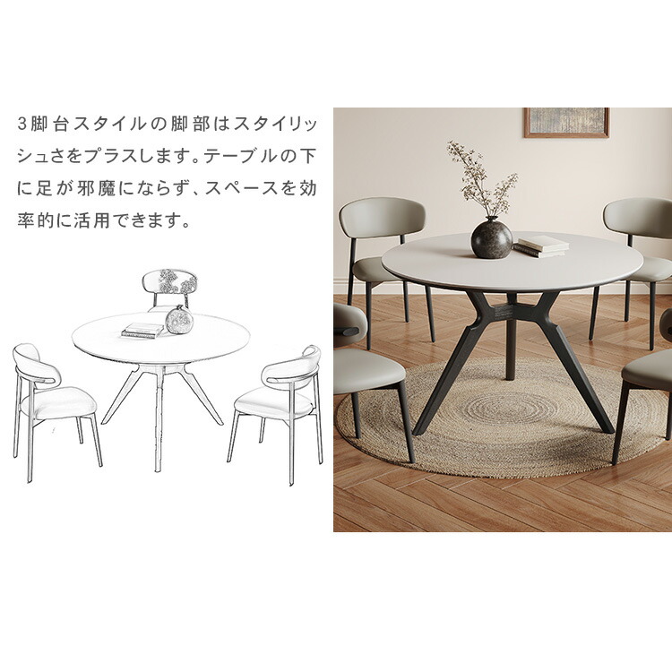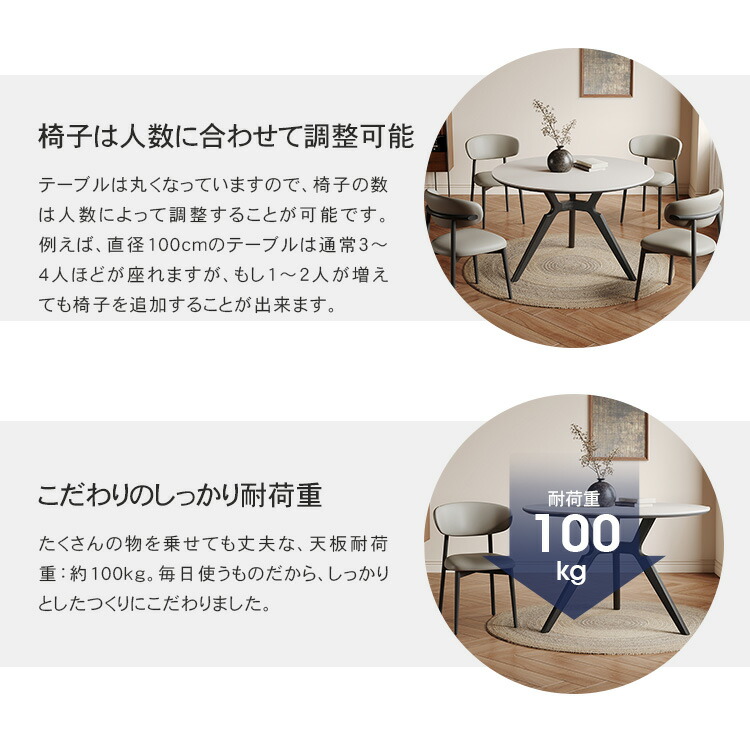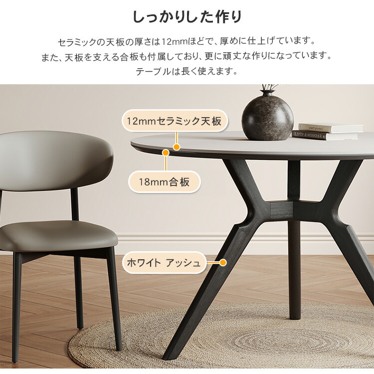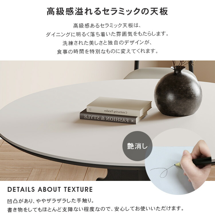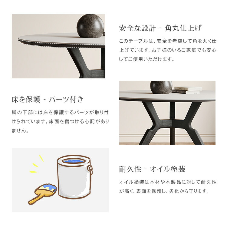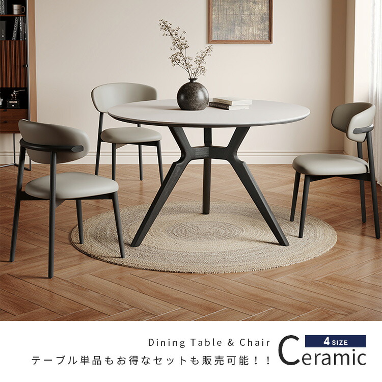 | おすすめのポイント | ■4サイズがご用意されており、お部屋の広さやテーブルの配置に合わせて最適な組み合わせをお選びいただけます。 ■円形テーブルは四角形のテーブルと違い、それぞれが対面に座る形となりますので、みんなの顔を見ながら会話を楽しんでいただけます。 ■下部にゆとりがあり、足元に広々とした空間があるため、快適なダイニング空間を実現し、リラックスした時間を過ごせます。 ■テーブルの角を丸くした安全に配慮した設計で、お子様のいるご家庭でも安心してご使用いただけます。 ■セラミック天板は高級感があり、耐久性も備えています。美しさと実用性を兼ね備えています。 |