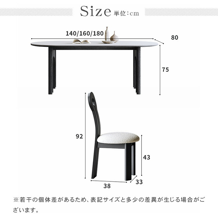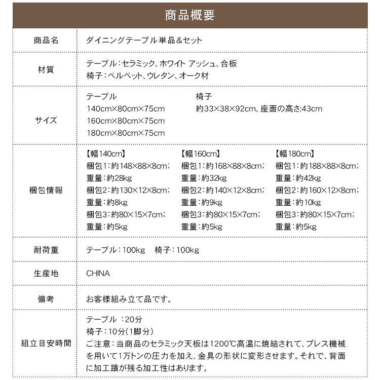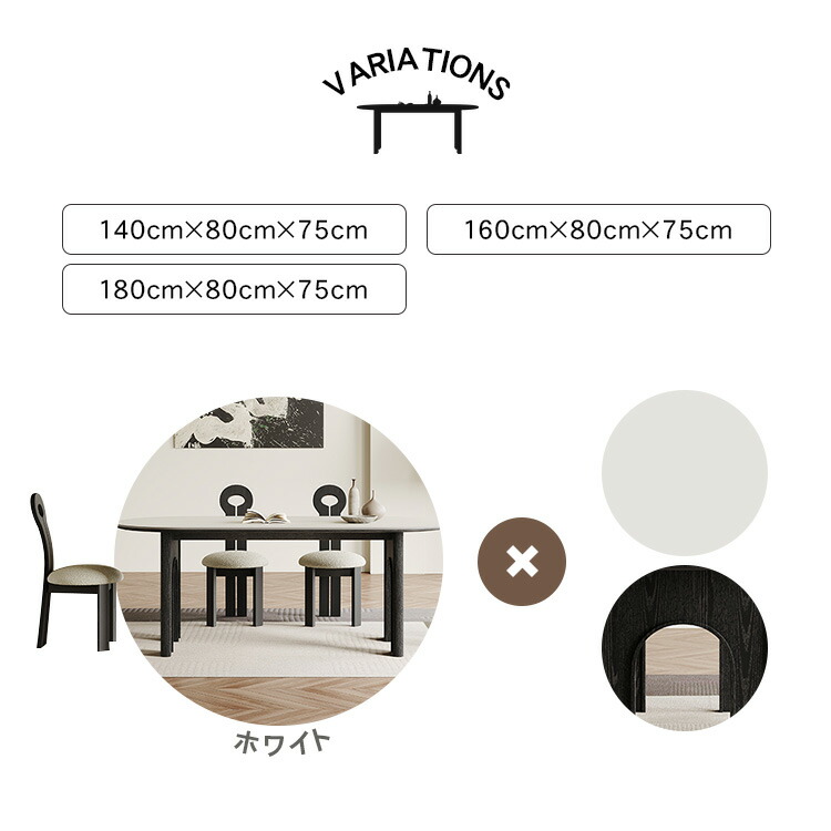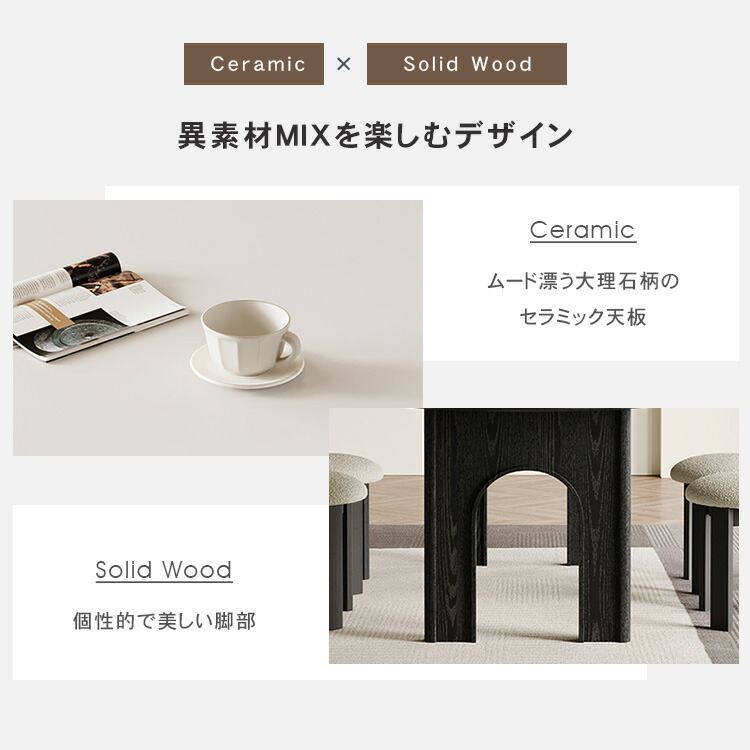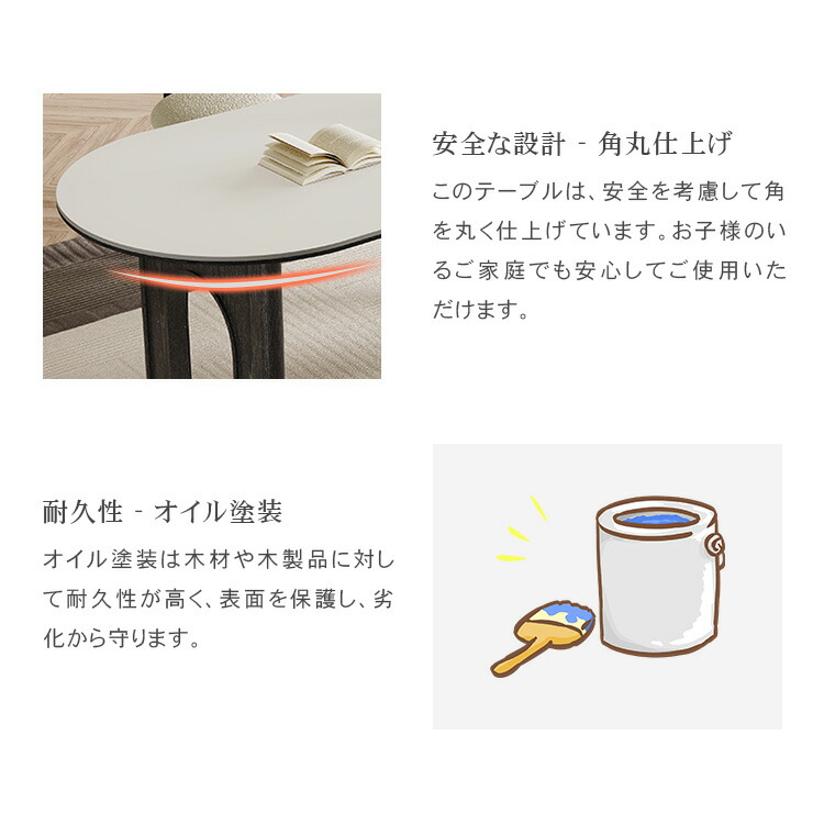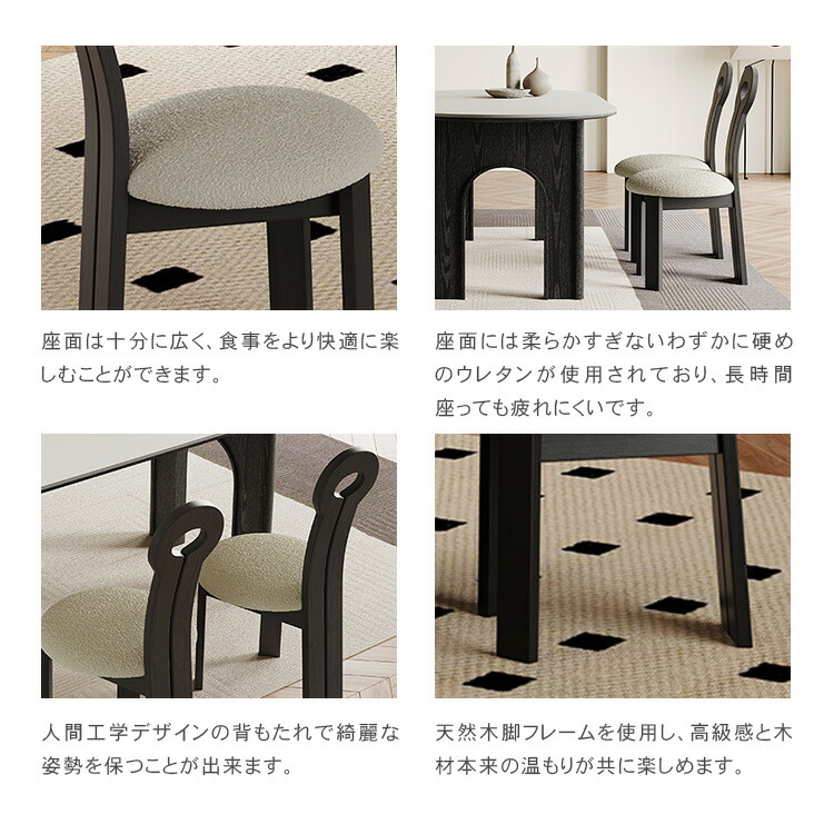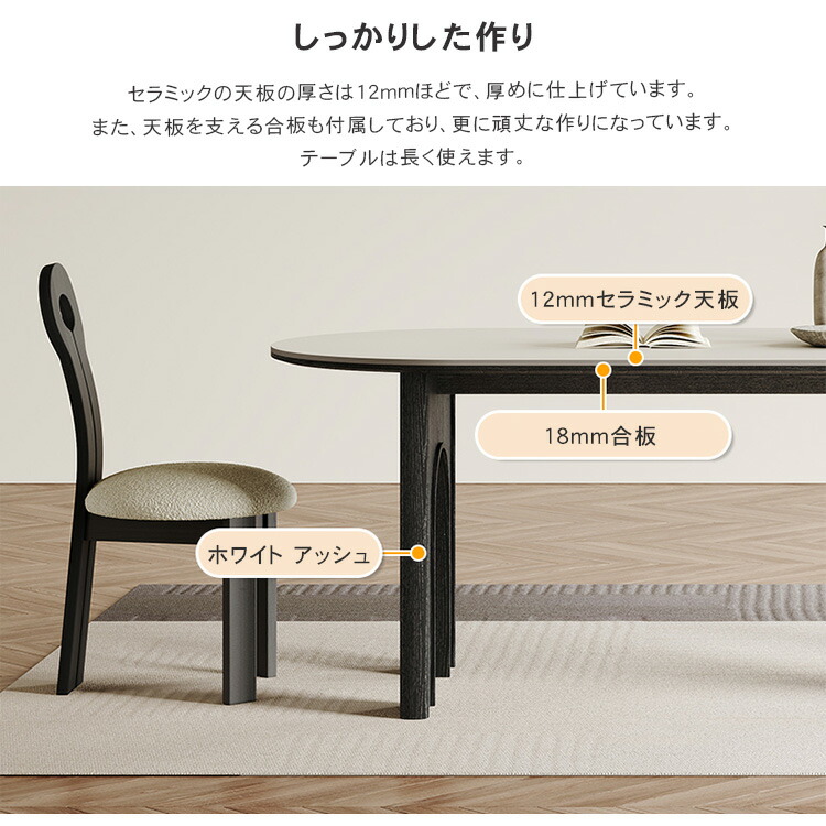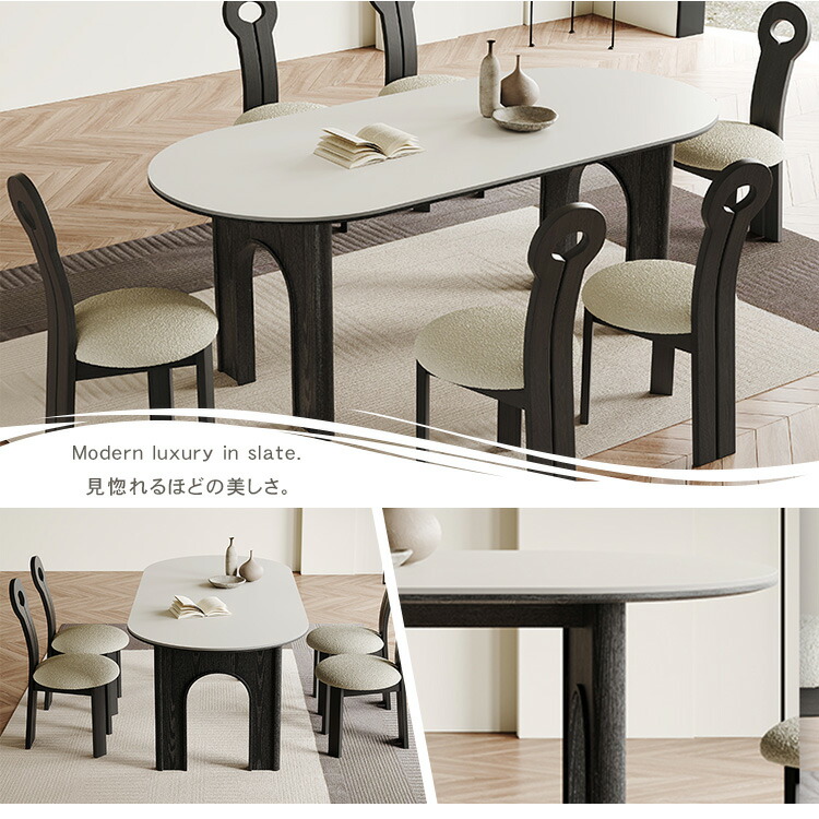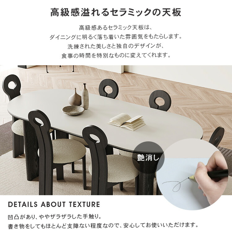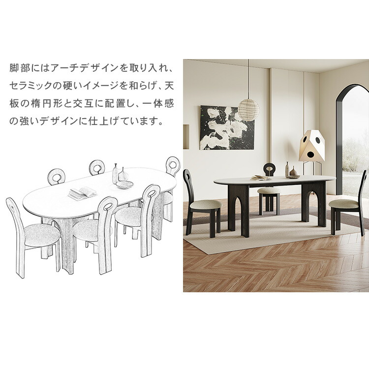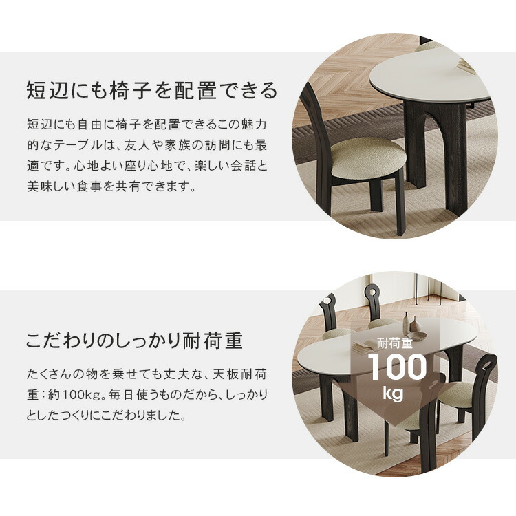 | おすすめのポイント | ■3サイズがご用意されており、お部屋の広さやテーブルの配置に合わせて最適な組み合わせをお選びいただけます。 ■短辺にも椅子を自由に配置できる魅力的なテーブル。友人や家族の訪問でも心配はありません 。 ■下部にゆとりがあり、足元に広々とした空間があるため、快適なダイニング空間を実現し、リラックスした時間を過ごせます。 ■テーブルの角を丸くした安全に配慮した設計で、お子様のいるご家庭でも安心してご使用いただけます。 ■セラミック天板は高級感があり、耐久性も備えています。美しさと実用性を兼ね備えています。 ■テーブルは、多くの場所に適応する柔軟性があります。狭いスペースにも置くことができ、壁に沿って配置することも可能です。 |