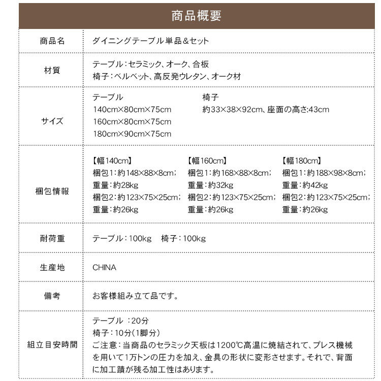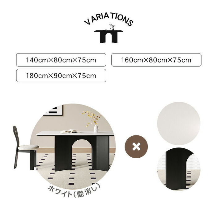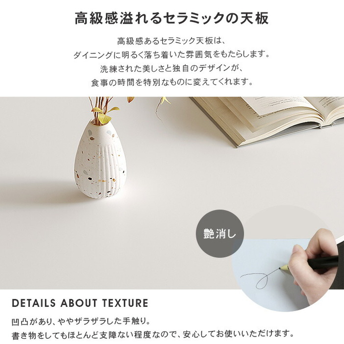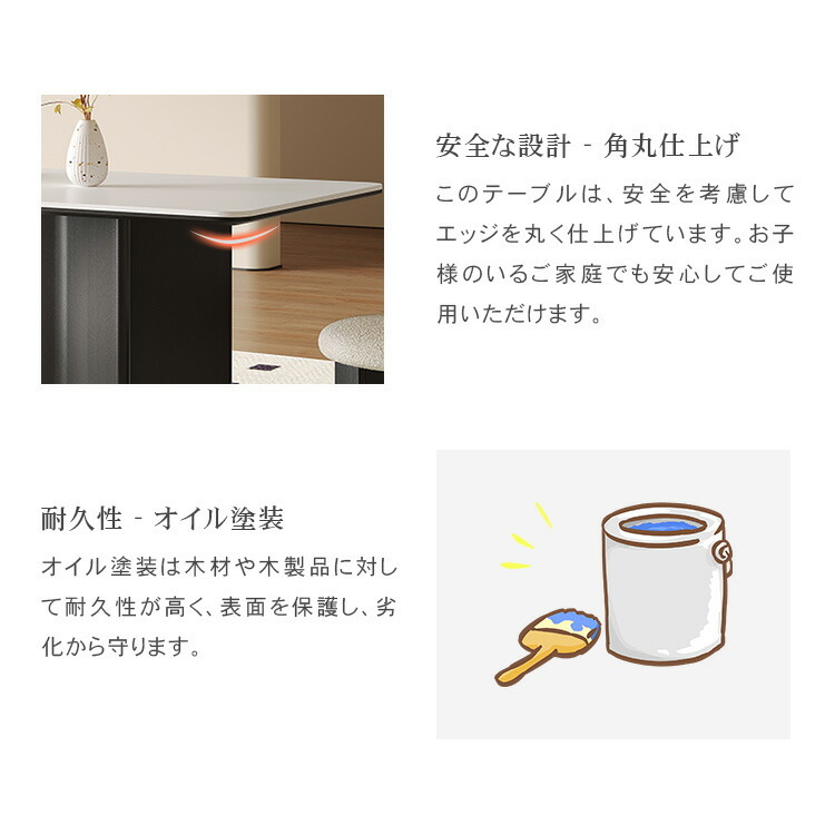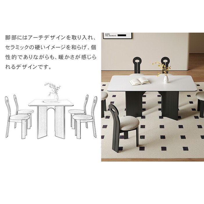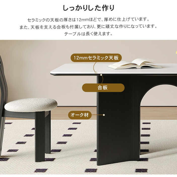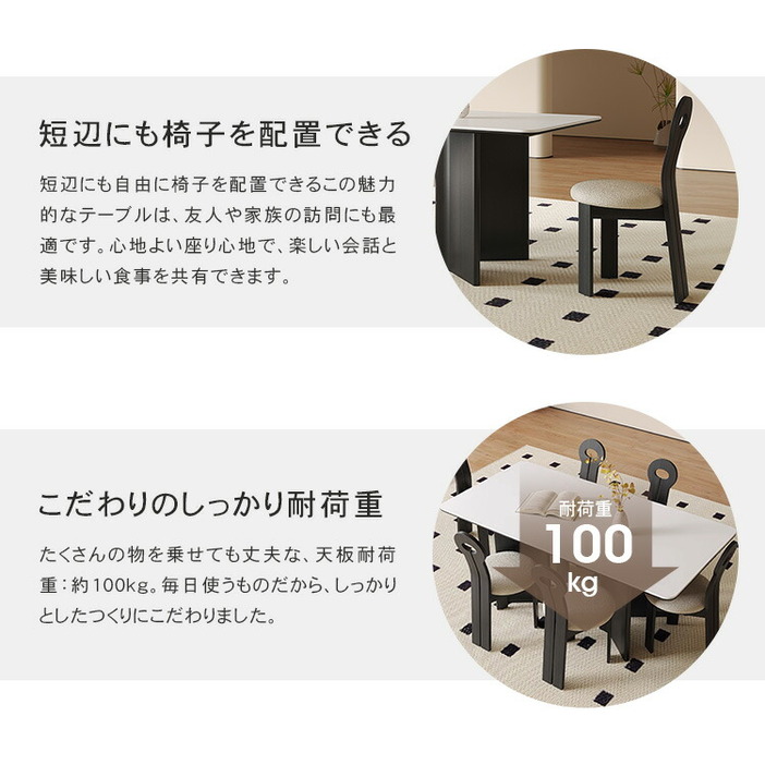 | おすすめのポイント | ■3サイズがご用意されており、お部屋の広さやテーブルの配置に合わせて最適な組み合わせをお選びいただけます。 ■短辺にも椅子を自由に配置できる魅力的なテーブル。友人や家族の訪問でも心配はありません 。 ■下部にゆとりがあり、足元に広々とした空間があるため、快適なダイニング空間を実現し、リラックスした時間を過ごせます。 ■テーブルの角を丸くした安全に配慮した設計で、お子様のいるご家庭でも安心してご使用いただけます。 ■セラミック天板は高級感があり、耐久性も備えています。美しさと実用性を兼ね備えています。 ■長方形のテーブルは、多くの場所に適応する柔軟性があります。狭いスペースにも置くことができ、壁に沿って配置することも可能です。 |