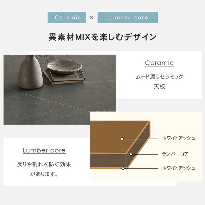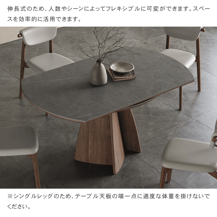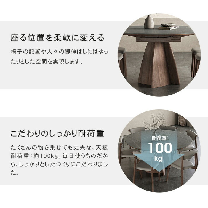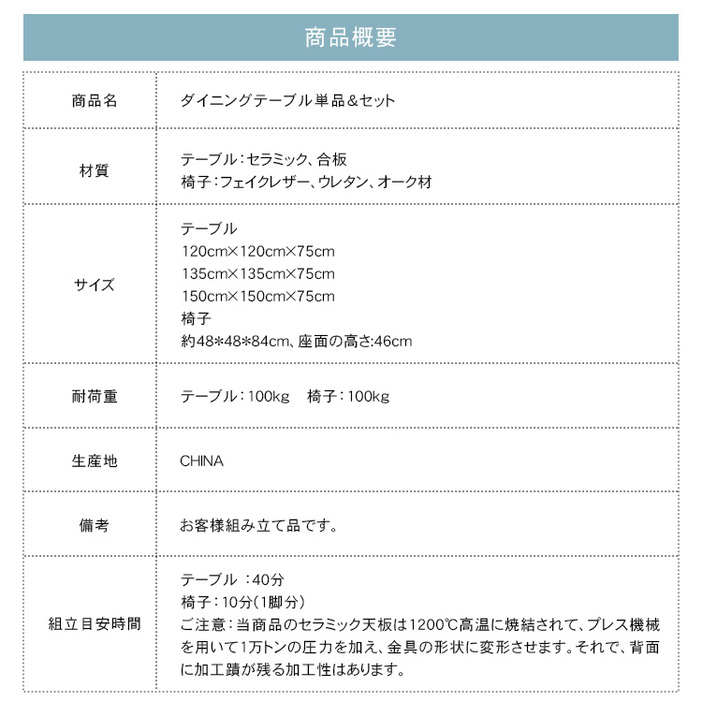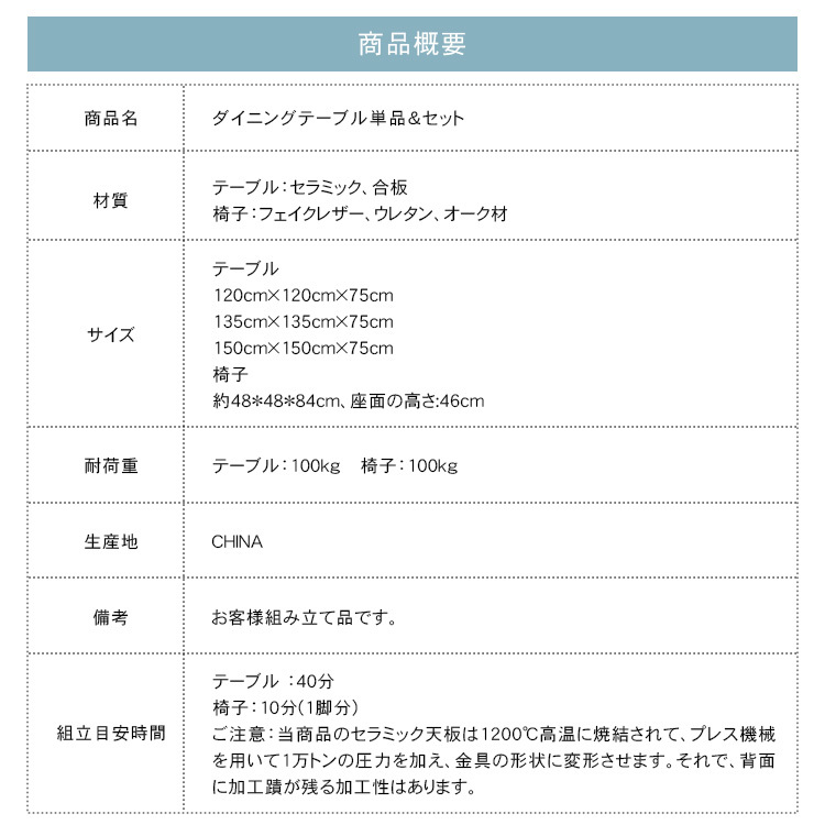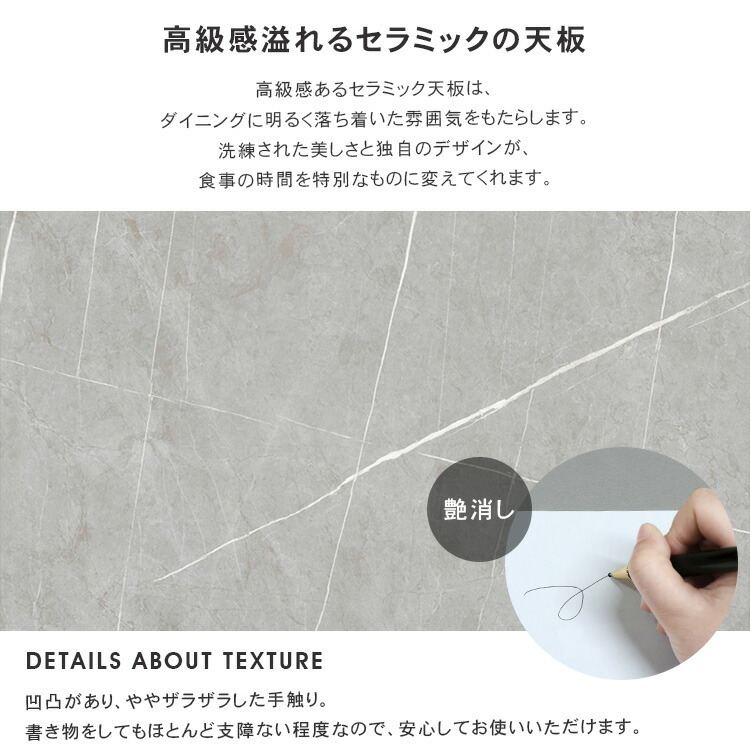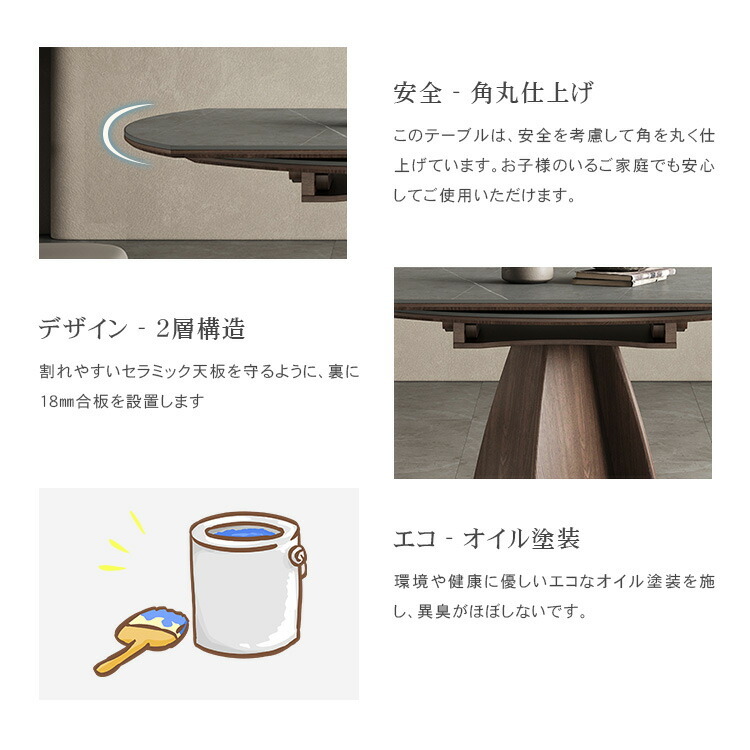 | おすすめのポイント | ■3サイズがご用意されており、お部屋の広さやテーブルの配置に合わせて最適な組み合わせをお選びいただけます。 ■人数やシーンによって、天板サイズ変更可能です。 ■下部にゆとりがあり、足元に広々とした空間があるため、快適なダイニング空間を実現し、リラックスした時間を過ごせます。 ■テーブルの角を丸くした安全に配慮した設計で、お子様のいるご家庭でも安心してご使用いただけます。 ■セラミック天板は高級感があり、耐久性も備えています。美しさと実用性を兼ね備えています。 |